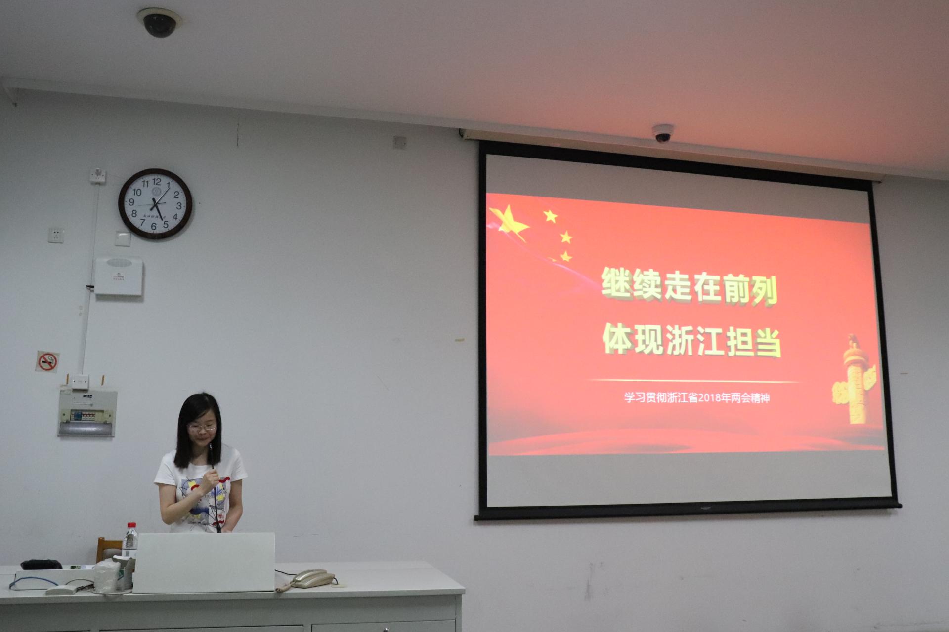 王伟伟老师简要介绍了浙江省的地理历史概况和浙江精神,由浙江省两会联系到新时代老员工,勉励同学们认真学习,贯彻两会精神,成为有格局、有理性、脚踏实地的人。