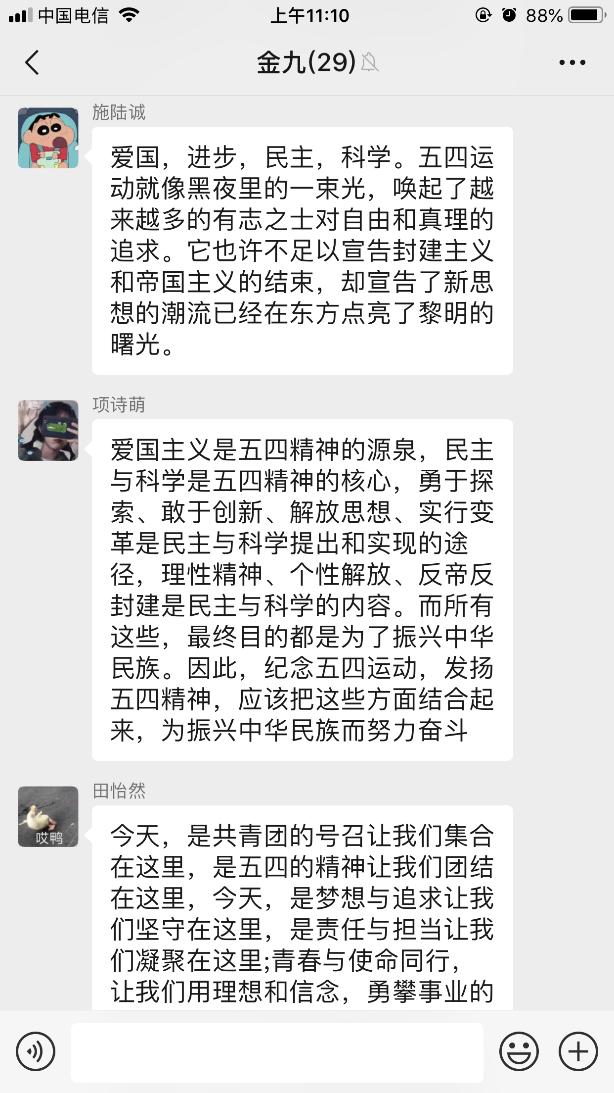 18金融三班团支书李鑫楠说,作为新时代的青年,我们要坚持中国共产党的领导,听党话,跟党走,把自己的小我融合进祖国和人民的大我中。要和广大人民一起为实现中华民族伟大复兴的目标而奋斗。新时代青年要积极发扬五四精神,高举爱国主义的旗帜,居安思危,艰苦奋斗,敢于创新,同时也要树立远大的抱负,担当时代的责任,立志成为德智体美劳全面发展的社会主义接班人。