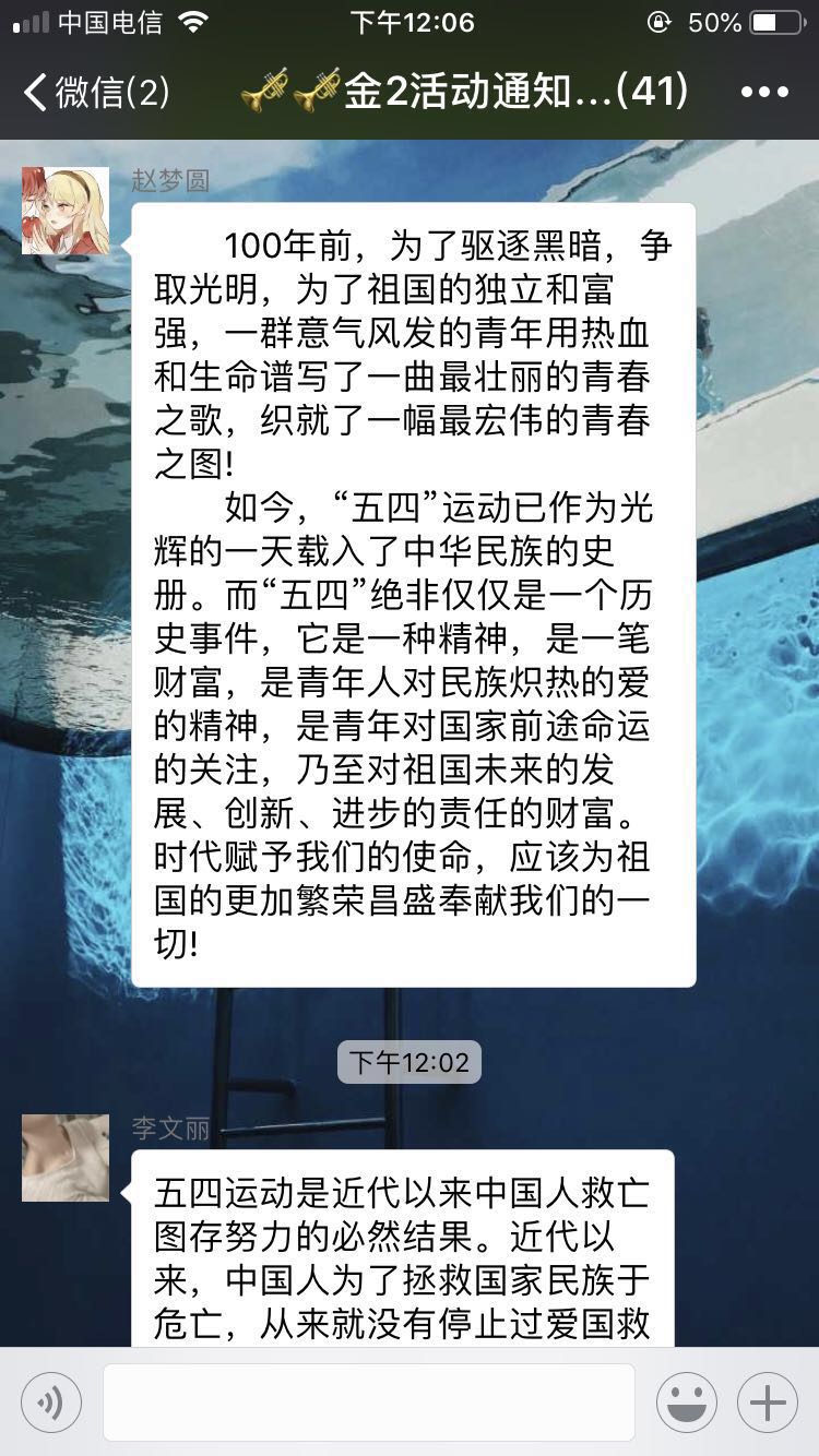 16金融国际班团支书宫雨婷说,可能没有哪个符号比“五四”这个词对年轻人更有感召力和触动力了,提起这个词,我们内心都会涌动出一股热烈的青春情怀,因为这个词里有历史,有热血,有无论你到了什么年龄都会感受到的青春基因和民族记忆。每到这个日子,我们都会想起那段关系国家命运转折的大历史,想起那场波澜壮阔激荡人心的爱国运动。作为如今的青年学子,我们要珍惜生活,砥砺前行,终有一天我们年华老去,青春不再的时候,会因我们曾奉献过自己的力量而没有丝毫遗憾。