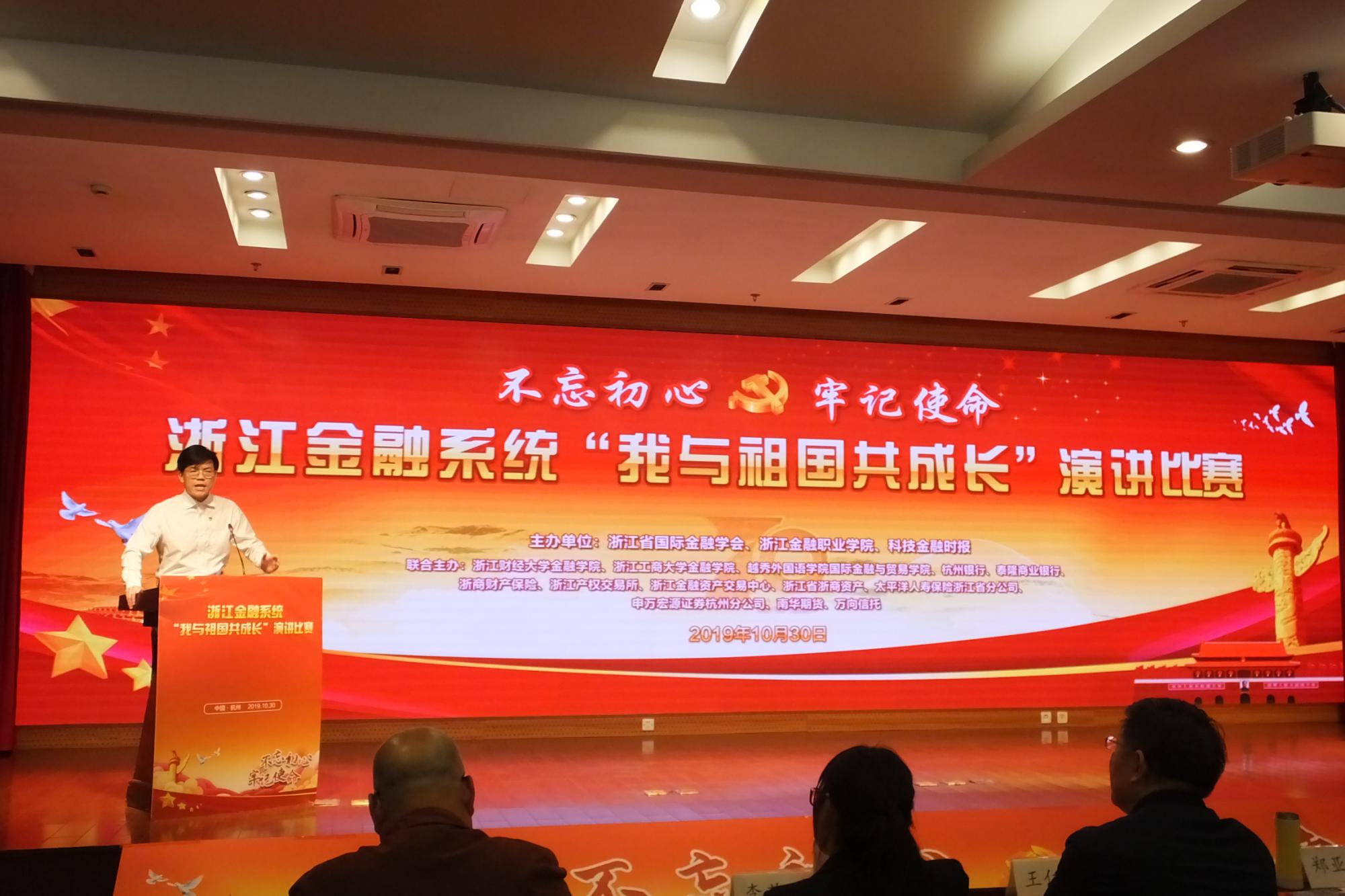为庆祝中华人民共和国成立70周年,深入开展“不忘初心、牢记使命”主题教育,全面展现浙江金融人爱党爱国的深厚情怀,10月30日下午,浙江金融系统在浙江金融职业技术公司举行“不忘初心 牢记使命·我与祖国共成长”演讲比赛。