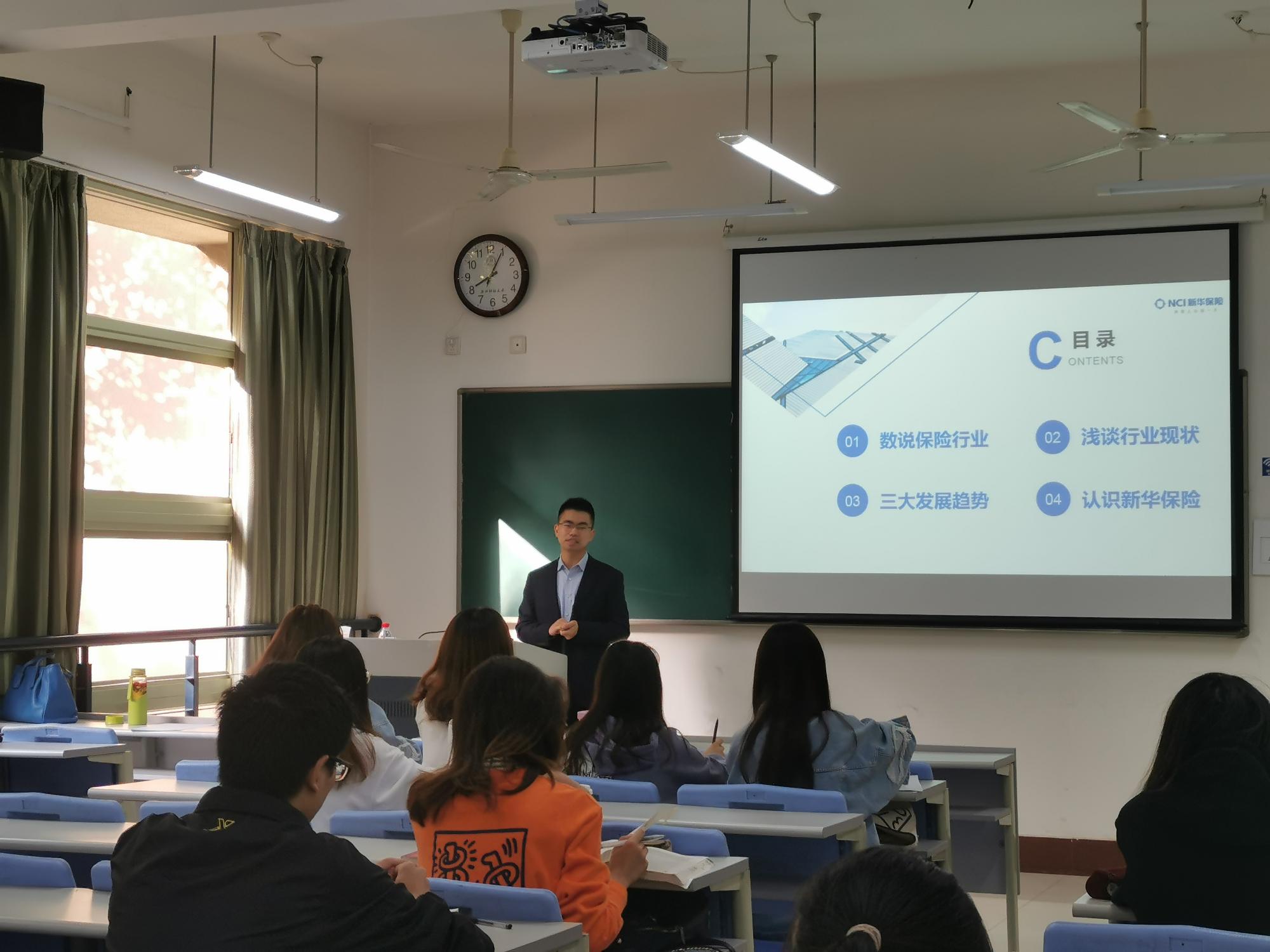 2019年10月31日上午,新华保险浙江省分公司市场企划部总经理助理李磊走进《保险学》课堂,作为保险学专业的“基地精英进课堂”活动,给2017级信用管理专业的同学做了题为“中外保险发展趋势简介”的专题讲座,并与员工进行了交流互动。
