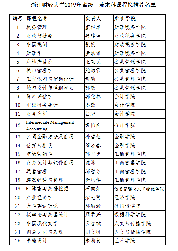 根据《浙江省教育厅办公室关于开展省级一流本科课程建设和国家级一流本科课程推荐认定工作的通知》(浙教办函〔2019〕334号)的相关要求,公司拟推荐《税务管理》等25门课程参加省级一流本科课程认定,其中公司朴哲范老师的《公司金融方法及应用》和阎晓春老师的《信托与租赁》获2019年省级一流本科课程立项推荐。