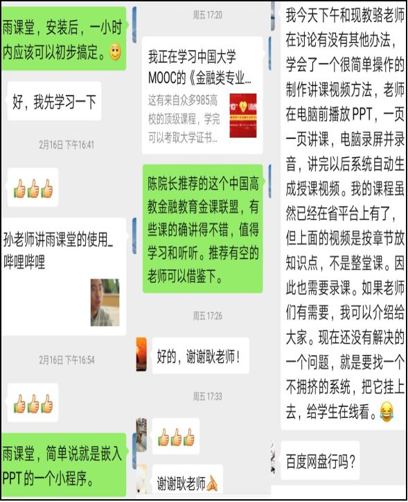 兵马未动,粮草先行。各类直播平台、软件的选择和使用是确保在线教学效果的关键一环。公司的老师们积极探索,克服困难,进行了多种尝试并及时共享心得。金融工程系的王聪聪教授针对《Investments》课程,总结和共享了“钉钉直播+OneNote”结合的在线教学使用心得。信用管理系的张超副教授针对《金融数据挖掘》实验课程的特点,分享了“雨课堂+QQ课堂+PPT录屏结合”的教学方式。保险与精算系的张代军教授结合《保险经营管理学》就如何用好浙江省高等公司在线开放课程共享平台和老师们进行了细致的分享。投资系的阎晓春副教授分享了“钉钉+《信托与租赁》慕课+雨课堂”的教学方法,其中《信托与租赁》慕课被中南大学、南京审计大学、四川农业大学等多家外省市高校异步或同步引用。金融学系的鲁莹博士针对《国际金融》课程的特点,探索和共享了“省在线平台+腾讯课堂”的在线教学方案。同时,阎老师和鲁老师的这两门课程在刚刚落幕的浙江省本科院校“互联网+教学”优秀案例(线上线下混合课程)的评选中喜获省二等奖,更是为线上教学的开展增添了力量。