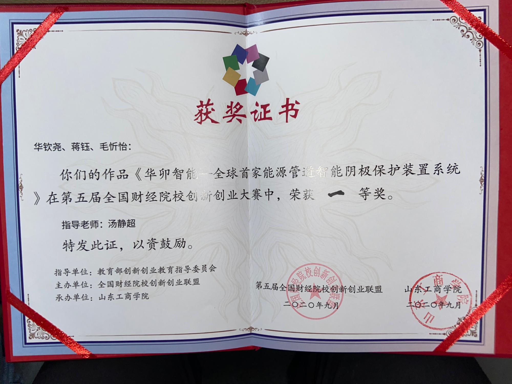 9月24日,全国财经院校创新创业联盟2020年会暨第五届全国财经院校创新创业大赛在山东工商公司举行,公司18中英金融专业华钦尧同学的“华卯智能——全球首家能源管道智能阴极保护装置系统”项目荣获一等奖。