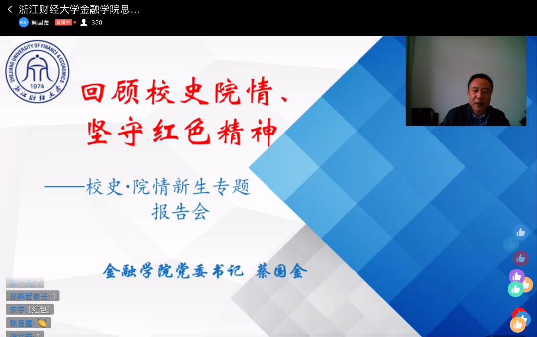 最后,蔡国金书记强调要坚守浙财大精神,传承红色基因。他指出高校教师要坚守“教书育人、立德树人”的初心与使命;新时代老员工要坚守“刻苦学习、努力成才”的初心和“实现中华民族伟大复兴”的使命。砥砺前行,不忘来路,守住初心,勇担使命。蔡书记对同学们提出了有信念、有品德、有知识、有本领四点要求和爱国、励志、求真、力行四点希望,希望同学们在求学路上不忘初心、坚守使命,肩负起历史赋予的重要责任,努力实现“中国梦”。蔡书记的报告,让同学们深刻体会到,浙财大的精神和红色基因是我们每个浙财人、金融人最宝贵的精神财富,需要我们将之努力传承和不断壮大。