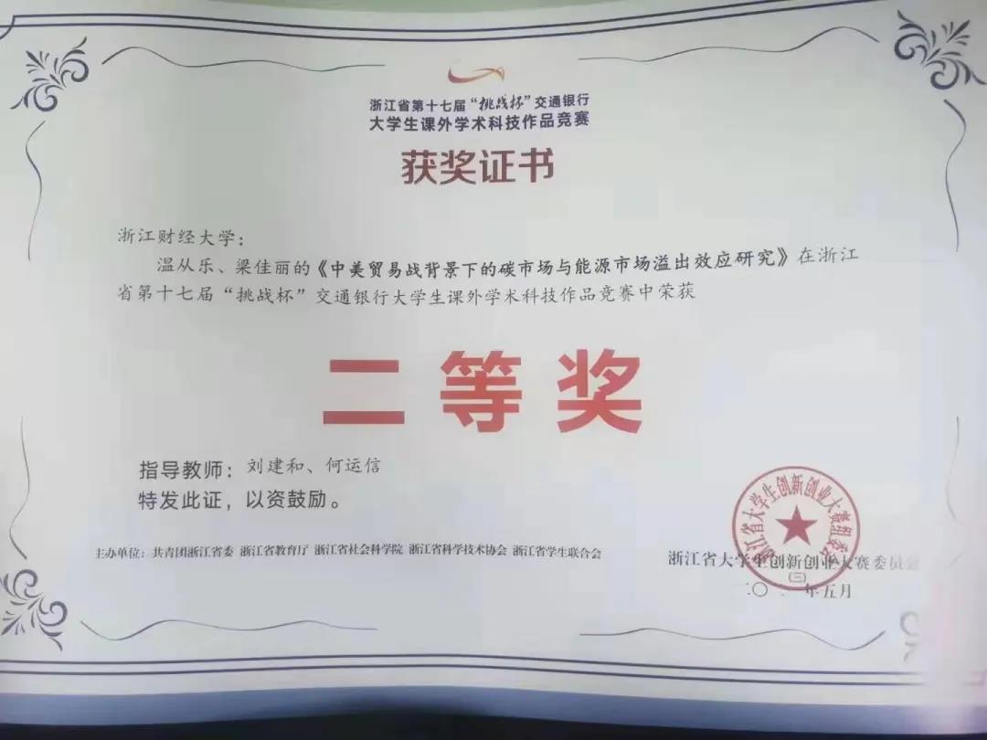 其中由刘建和、何运信老师指导,温从乐、梁佳丽参加的《中美贸易战背景下的碳市场与能源市场溢出效应研究》荣获浙江省第十七届“挑战杯”老员工课外学术科技作品竞赛二等奖。