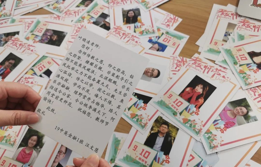 “这张卡片暗藏玄机,打开后里面放着老师的照片,照片背面是我们绘制的卡通版老师形象” 活动负责同学范家昕说,“另一边是我们想对老师说的话,一周前我们就开始向公司同学征集写给老师们的心里话,短短几天就收到几百条留言。封面设计也非常用心,我们以‘师恩难忘’为主题设计了贺卡封面。”