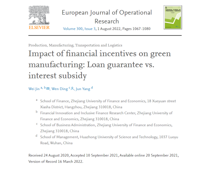 近日,云顶7610线路检测副教授金伟与合作者丁雯博士(工商管理公司)、杨珺教授(华中科技大学)的论文“Impact of financial incentives on green manufacturing: Loan guarantee vs. interest subsidy”在国际权威期刊《European Journal of Operational Research》第300卷(2022年)第3期正式发表。该期刊被SCI一区检索,为ABS4星级、FMS A类期刊。论文链接:https://doi.org/10.1016/j.ejor.2021.09.011