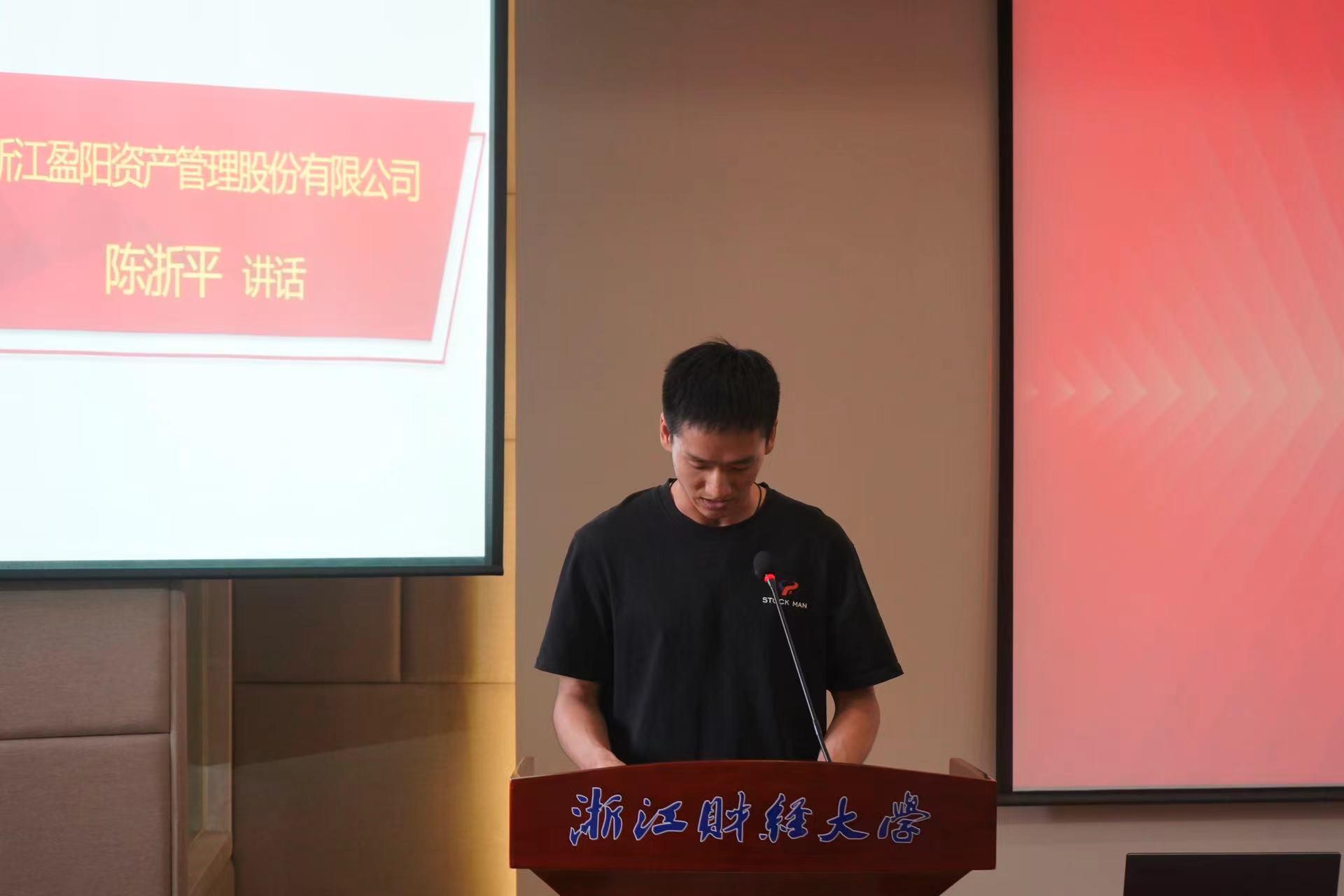 接着,浙江盈阳资产管理股份有限公司基金经理、16届员工陈浙平代表讲话。他提到,今年是“盈阳金融突出贡献奖”评审的第八年,在公司广大师生员工的共同努力下,公司的教学质量不断提高、科研与社会服务建设不断提升、学科专业建设不断突破、育人成果成效显著。他感恩铭记老师的谆谆教诲,衷心祝愿公司和公司越办越好,能够为社会输送更多专业性金融人才。