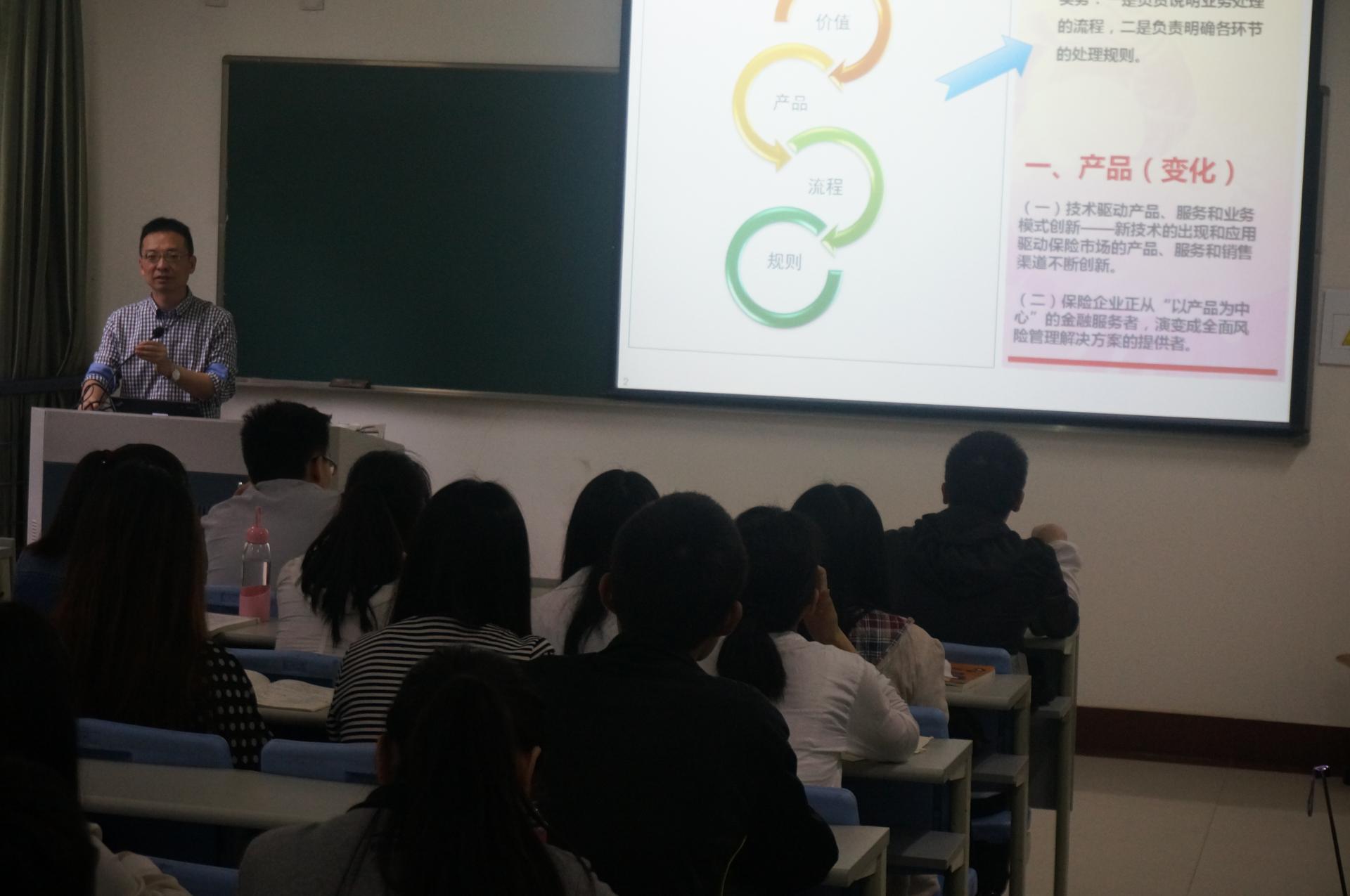 作为《保险学》课程教学方式改革创新的一次尝试,在任课教师叶晓凌老师的邀请下,胡先生在百忙之中抽出时间,来到公司《保险学》课堂为同学们作了 “保险公司销售与理赔—产品、流程、规则、价值”的专题讲座。不同于我们从教科书上所学的理论知识,胡先生以机动车辆保险承保与理赔为出发点,通过各种翔实的案例与资料,向同学们全方位的展示了互联网时代大数据的应用对财产保险实务带来的巨大变革,以及由此引发的对现有保险理论的重新思考和跟进研究。同学们全神贯注地聆听,并与胡岱磊先生进行了互动提问,课堂气氛活跃。类似于基地精英进入进课堂的方式,无异于对同学们开拓眼界、了解教材之外的实务知识、加深课堂理论知识的掌握、提高同学们专业课学习兴趣都有着极大的帮助。