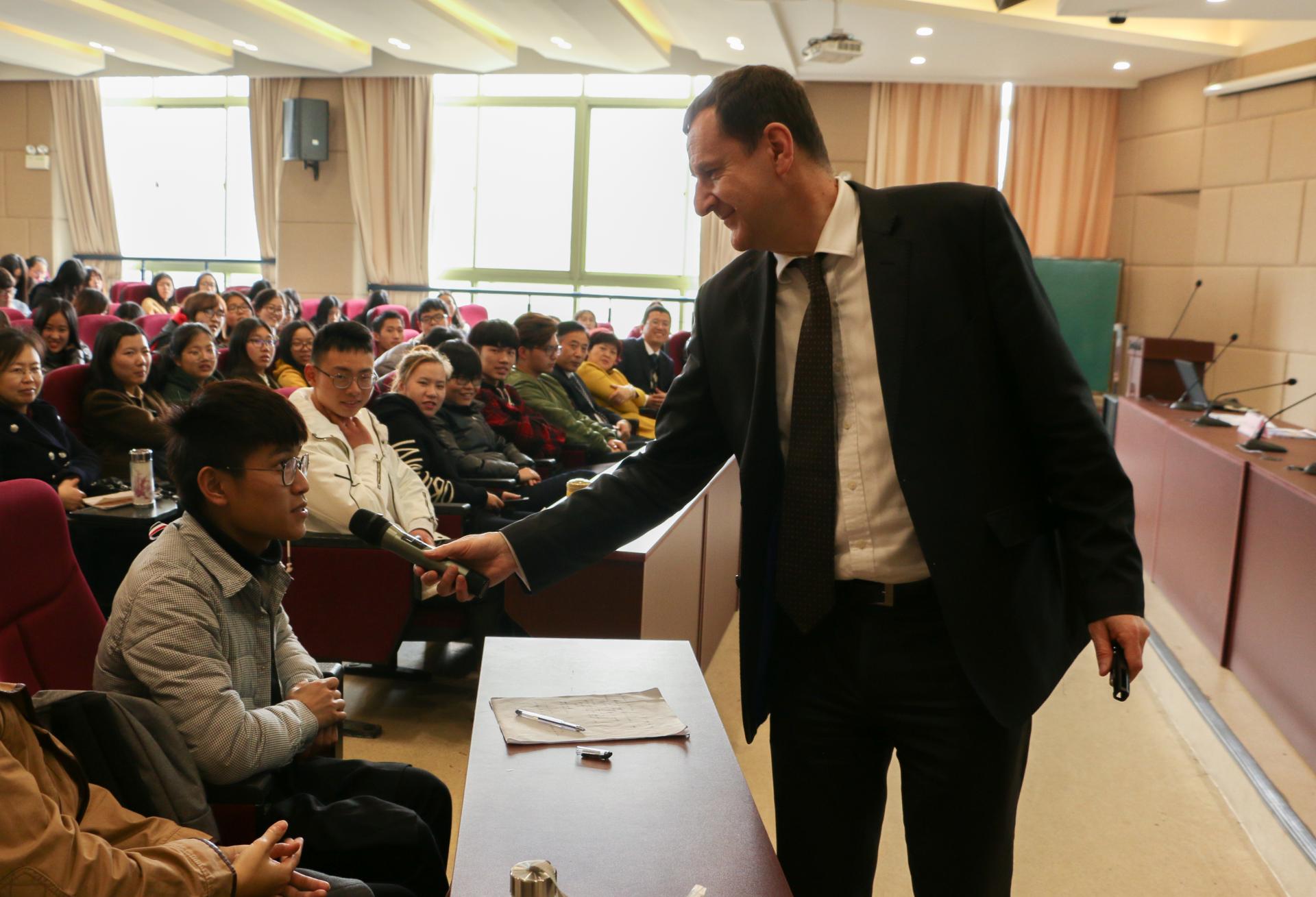 讲座现场气氛热烈,在座的同学们热情高涨。威廉姆斯教授精彩绝伦的讲座激发了同学们出国深造的兴趣,员工们流利的英语和整体素质也给威廉姆斯教授留下了深刻的印象。
