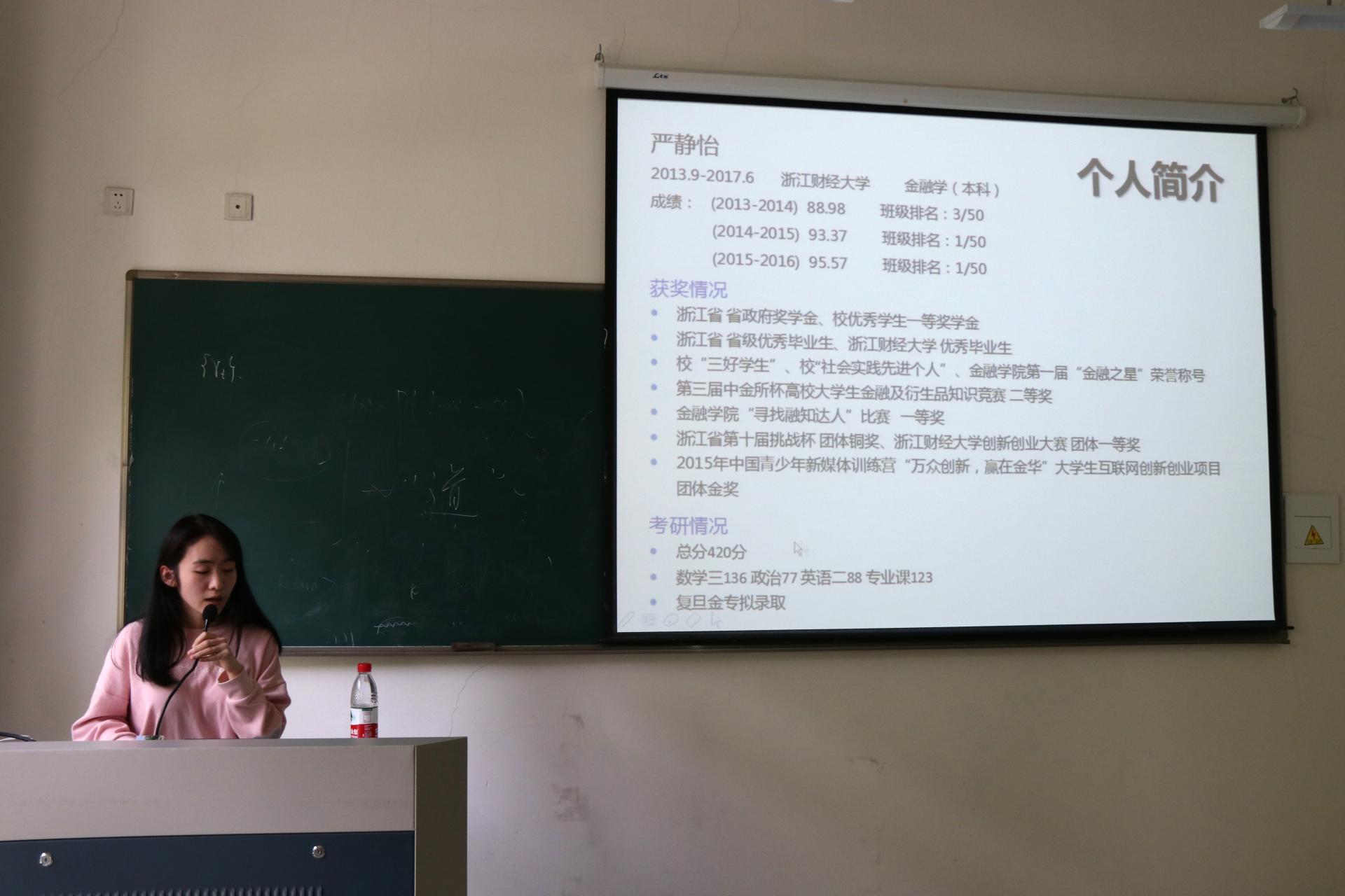 4月18日下午1:30,第三期“金才讲座”之考研篇在公司楼107顺利举行。本次讲座由13级金融学专业严静怡同学主讲。
