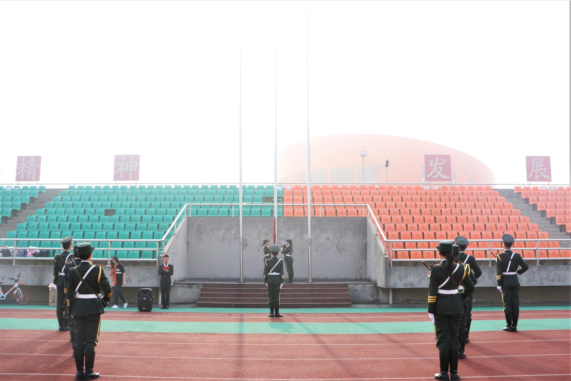 随着铿锵的脚步声,国旗护卫队的成员们护送着神圣的国旗来到主席台的中央。在激昂的国歌中,红旗缓缓升起,全体师生行注目礼。在庄严的氛围中,员工代表王光育、宋鹏举发表国旗下讲话:倡导同学们不忘初心、注重实干、知行合一;牢记习近平总书记的殷切希望,努力成为有理想、有学问、有才干的实干家。