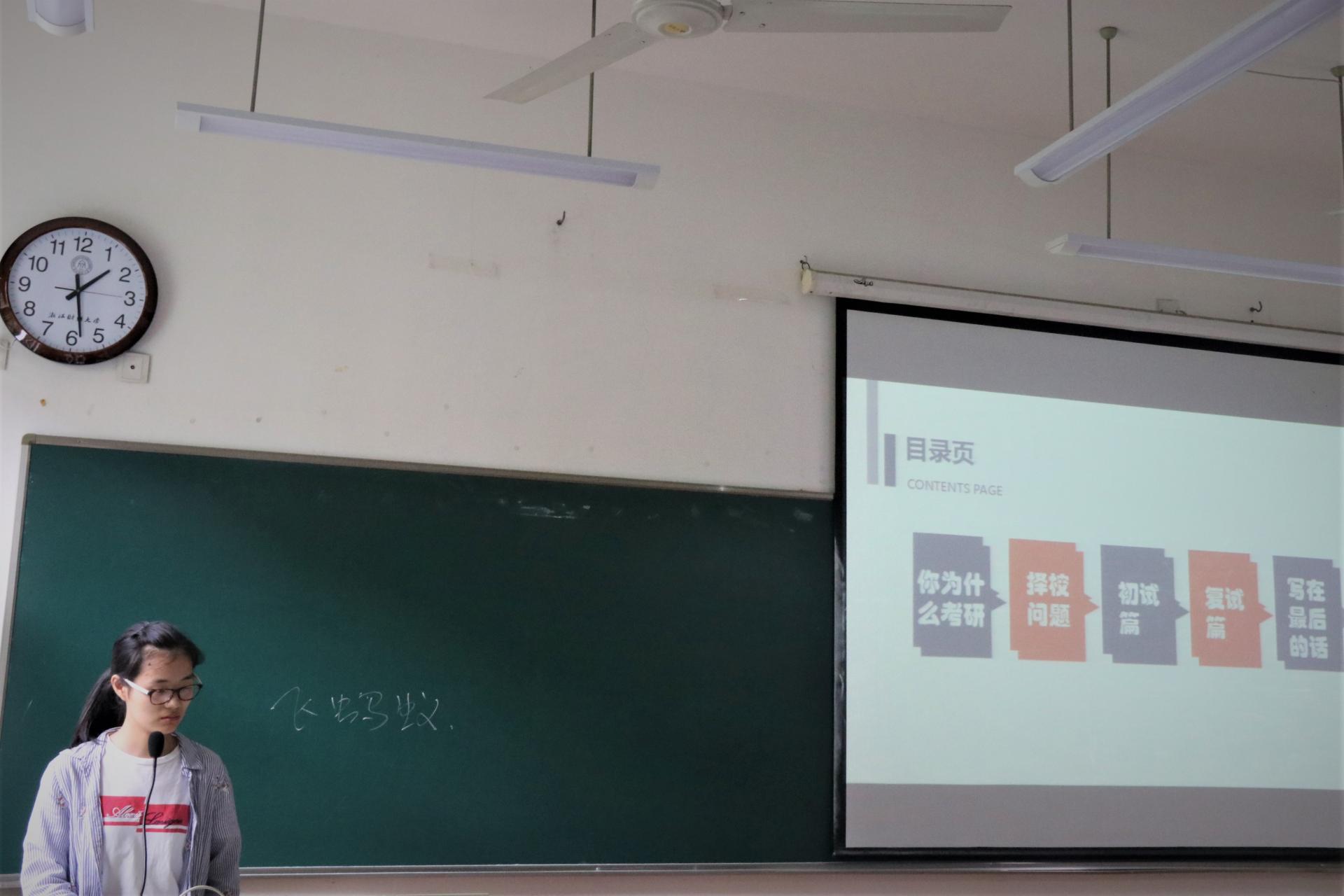 王俊俏同学首先讲到要明确考研的目的,明确的目的是内心坚持与努力行动的源动力,并强调不要一味地追求名校和热门专业,要选择与自己实力相符的公司。在考研准备方面,她以自身经验为例,与同学们分享了一些考研复习的技巧与方法,建议同学们寻找研友,互相多交流学习心得。对于考试时间安排,她提出要练好解题速度,掐点做题。之后的问答互动环节中,同学们积极地提出考研相关问题,王俊俏同学一一作答并鼓励同学们保持良好心态,坚定选择,在考研的历程中不忘初心,不负韶华。