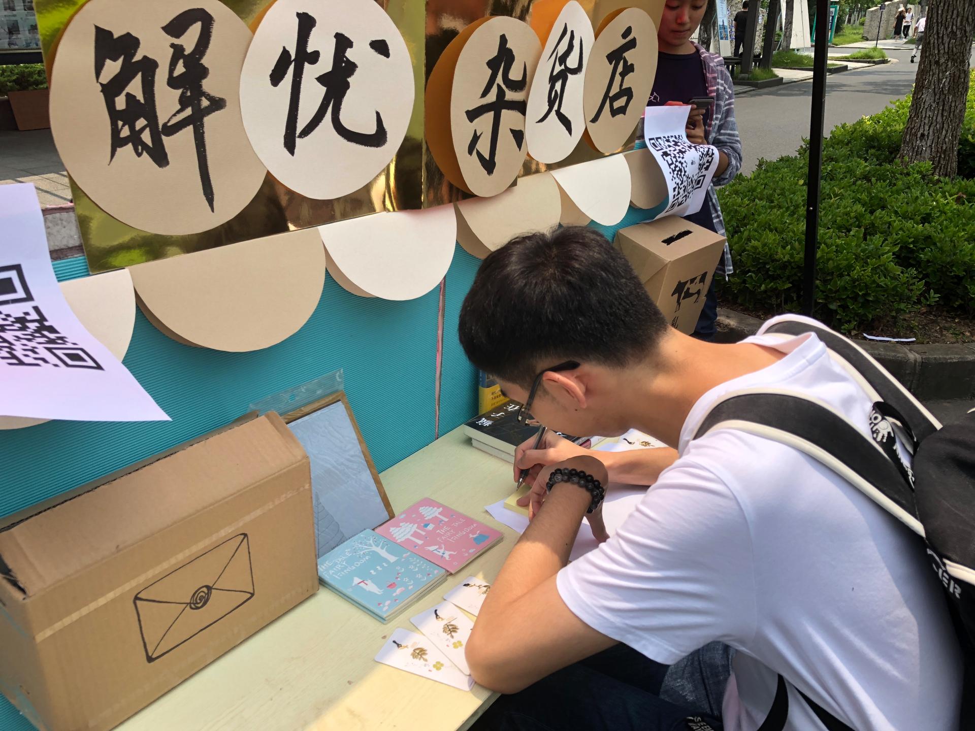 6月4日中午,在文化长廊,我们搬出了精心制作的手工摊位——一个现实版的“解忧杂货店”,同学们在“杂货店”的窗口前写下自己的烦恼,公司心理委员则在窗口后面同学们进行解答。每个想要“解忧”的同学都通过这个奇妙而又亲切的小小窗口,写下了平日里或许未曾向谁倾诉过的心声。