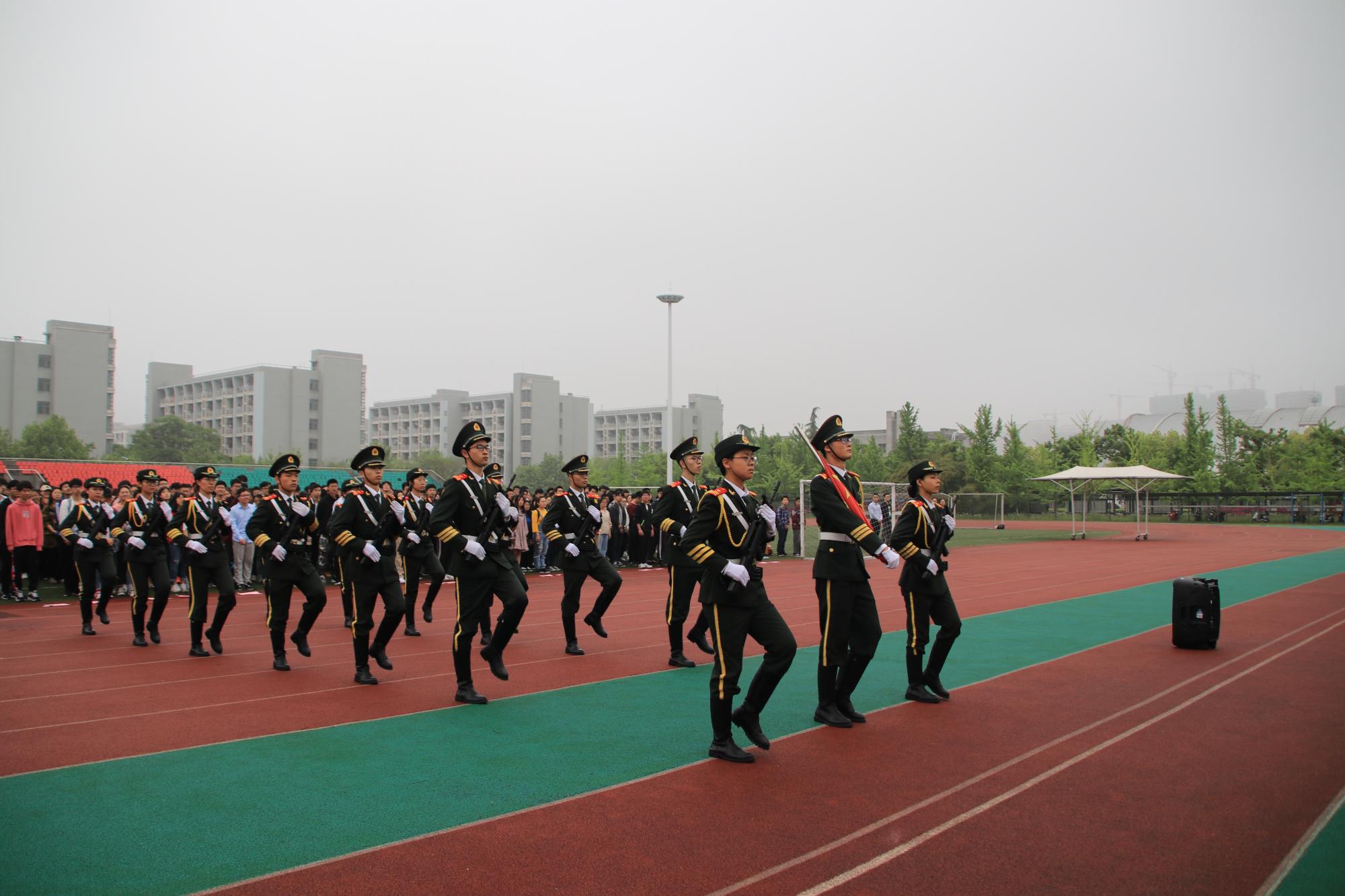 伴随着铿锵有力的脚步声,国旗护卫队的成员们严肃庄重地护送着神圣的国旗来到主席台的中央。在激昂的国歌声中,国旗护卫队们们整齐敬礼,红旗缓缓升起。全体师生行注目礼,场面庄重严肃。在庄严的氛围中,员工代表郭勤甫、吕想发表国旗下讲话,倡导同学们不忘初心,注重实干,知行合一,心中有国,牢记习近平总书记的殷切希望,不忘我们中华儿女的使命,努力成为有理想、有学问、有才干的实干家。