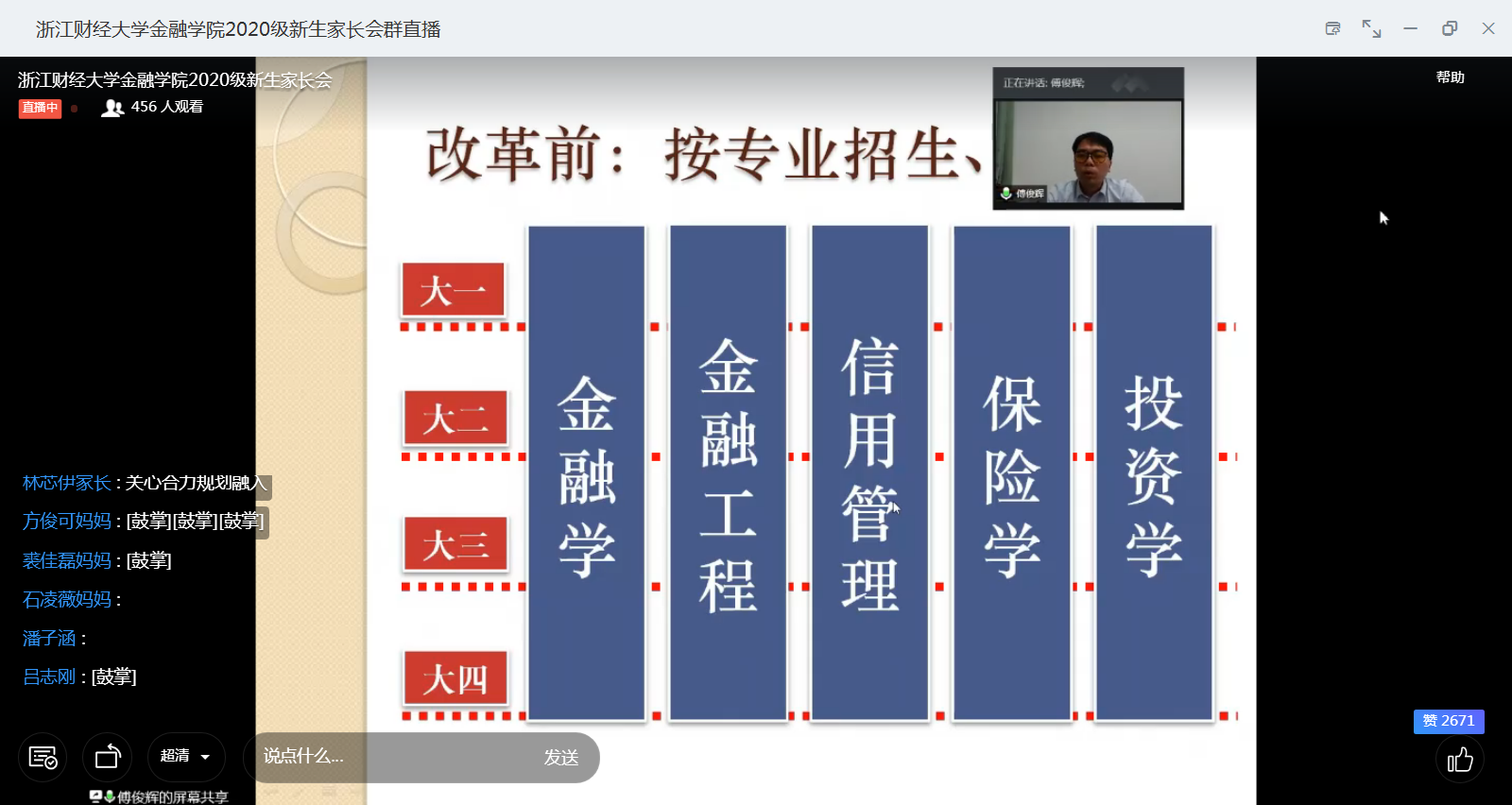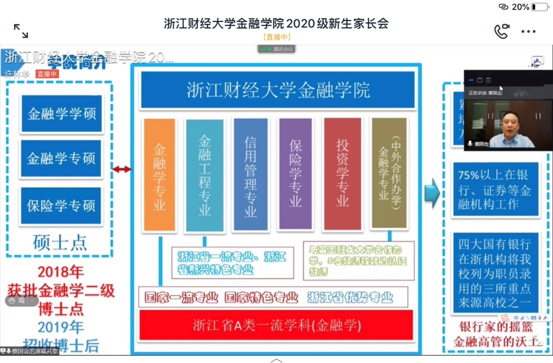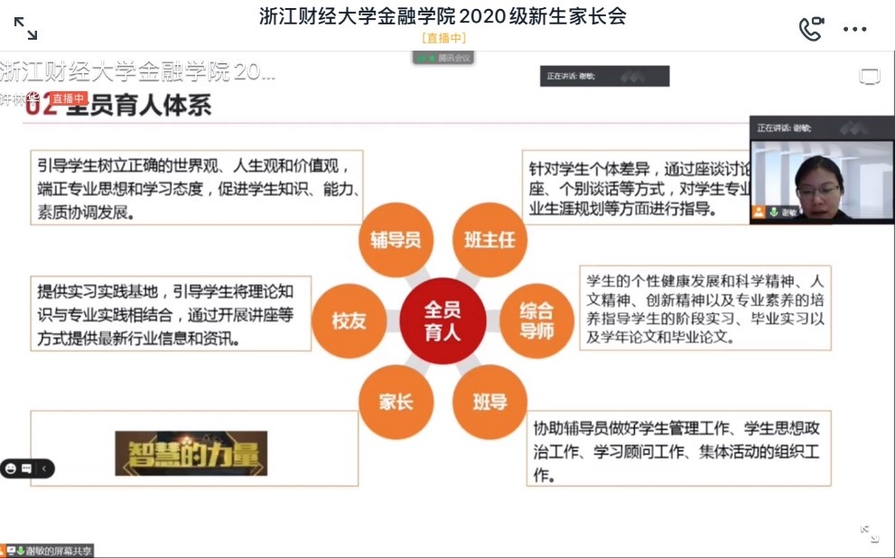 谢敏副书记特别提出了“全员育人”的理念,强调了辅导员、班主任、综合导师、家长、班导、员工在员工发展过程中起到的重要作用。她为家长们介绍了公司2020届毕业生升学就业情况,公司2020届本科毕业生升学率40.04%,为全校第一,公司信用管理专业升学率44%为公司升学率最高的专业,16中英金融班升学率68.75%为公司升学率最高的专业。她分析了公司2020级新生的生源背景,并对获得“双财奖学金”的同学表示了祝贺。她鼓励同学们积极参与第二第三课堂,全面提升竞争力,为争取更高的目标而努力。最后,谢敏副书记还贴心地从新生适应问题、学业问题、心理问题、诚信问题、安全问题几个方面提出了几点建议,希望家长加强家校联系,帮助孩子培养独立自主能力,以更好地适应老员工活。