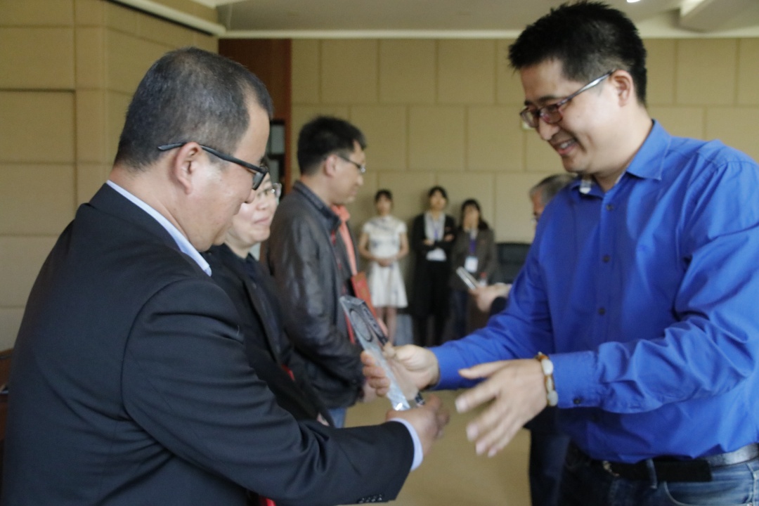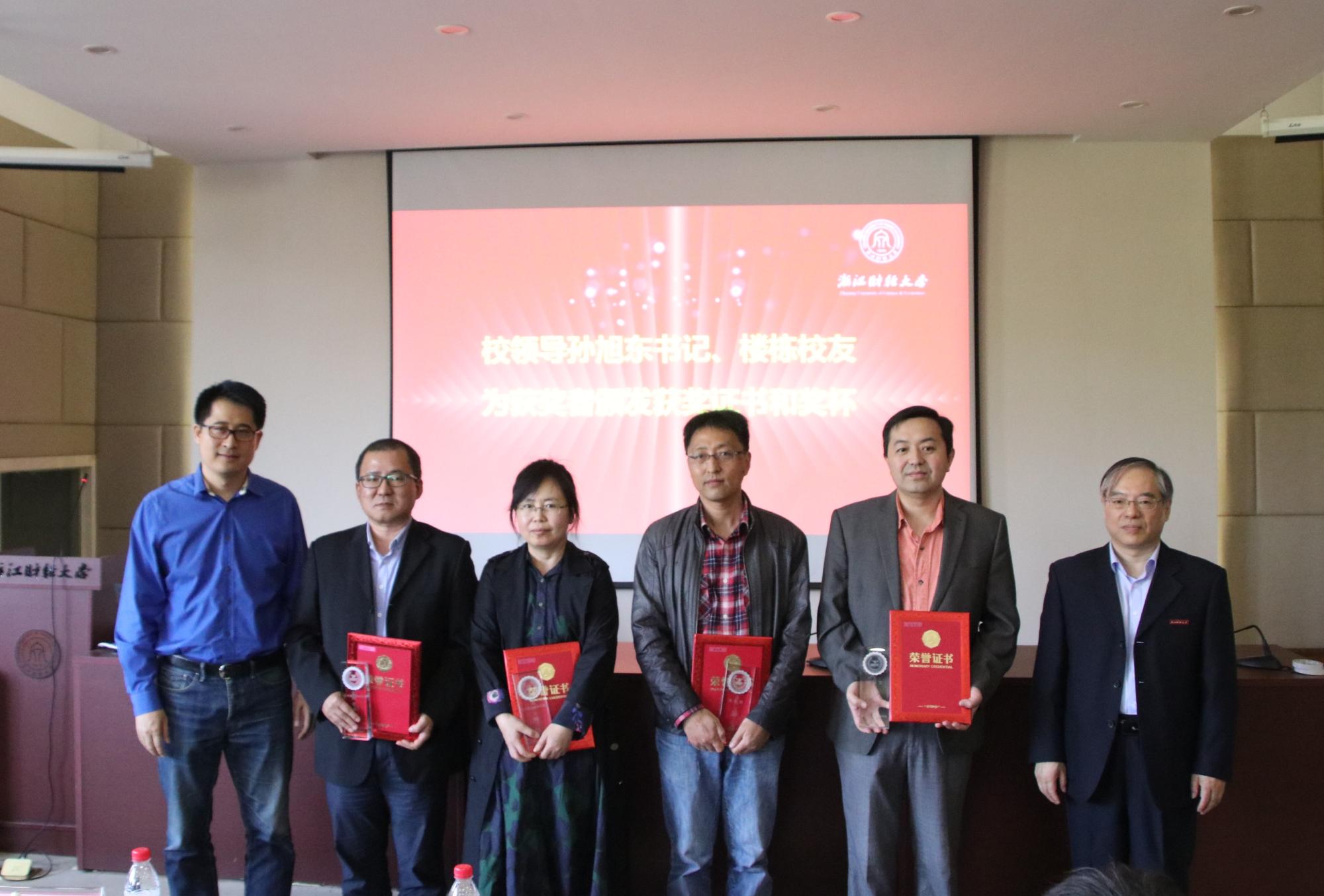 经评审,朴哲范老师、阎晓春老师分别获得2020年盈阳金融突出贡献奖教学类银奖;钟立新老师、耿中元老师分别获得科研与社会服务类银奖。孙旭东书记、楼栋员工为获奖老师颁发了获奖证书及奖杯。