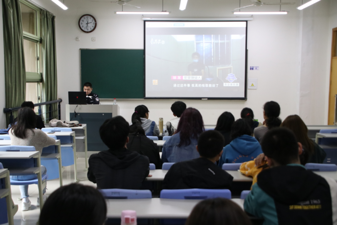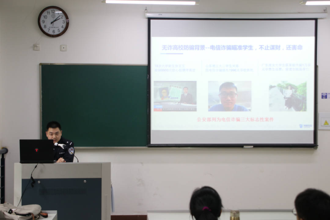 本次讲座的主题为防范网络电信诈骗。王警官结合实例首先介绍了三起标志性的电信诈骗,向同学们介绍了电信诈骗的表现、危害性以及防范措施的必要性。紧接着,王警官还展示了下沙区高校电信网络诈骗案件的发案情况,可见电信诈骗离我们的距离并不遥远。