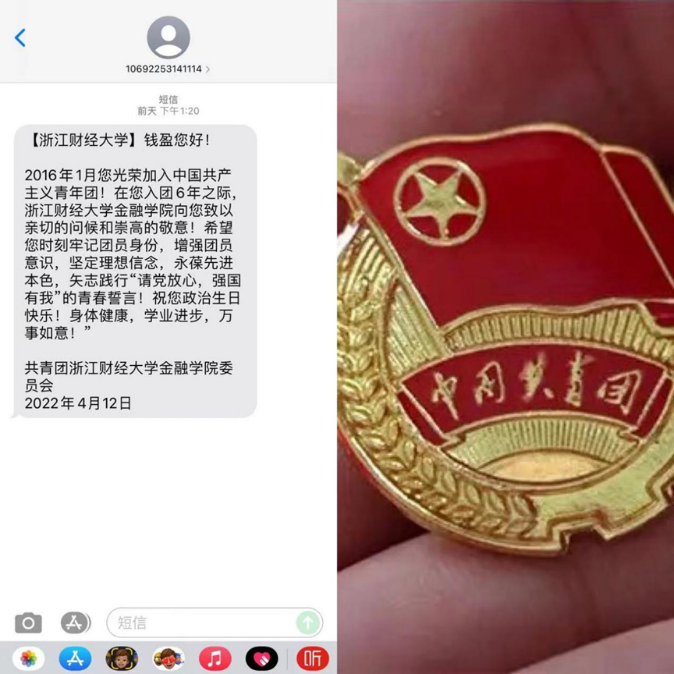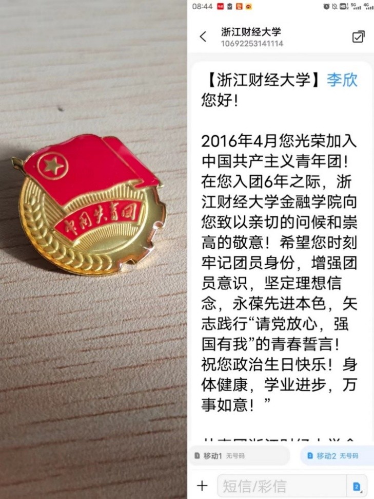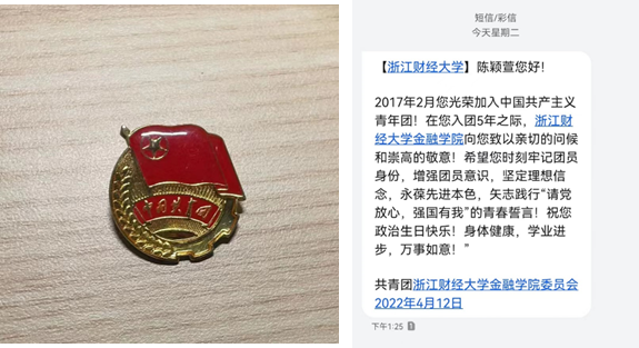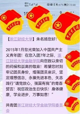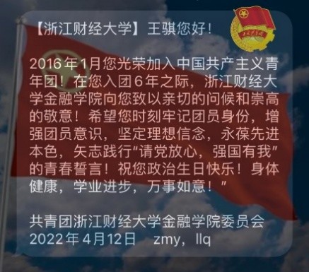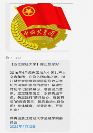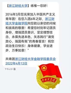 “金融学子您好!2015年5月您光荣加入中国共产主义青年团!在您入团7年之际,云顶7610线路检测向您致以亲切的问候和崇高的敬意!希望您时刻牢记团员身份,增强团员意识,坚定理想信念,永葆先进本色,矢志践行‘请党放心,强国有我’的青春誓言!祝您政治生日快乐!身体健康,学业进步,万事如意!”