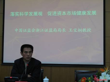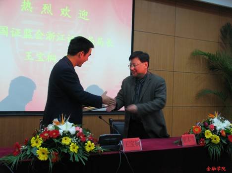 11月23日,金融论坛第六场学术讲座在学术交流中心二号报告厅顺利举行。中国证监会浙江证监局局长王宝桐莅临公司并为公司师生带来了一场题为《落实科学发展观,促进资本市场健康发展》的精彩讲演。浙江财经公司党委书记童本立教授,云顶7610线路检测经理虞群娥教授等嘉宾出席了本次讲座。童本立书记向王宝桐局长颁发浙江财经公司兼职教授聘书,并对王局长的到来表示热烈欢迎。