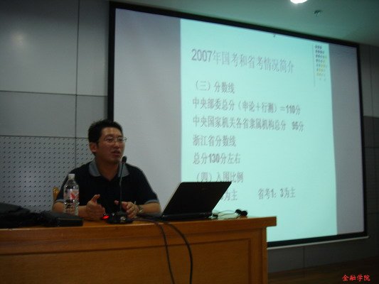 在简要分析了08年中央和浙江公务员考试的形势后,施老师着重就考前复习的安排谈了自己的见解,并与同学们分享了多年研究考试题型的一些心得,配合例题点拨同学们的思路,启迪大家的思维。精辟的分析使在场的同学获益匪浅,大家都认真地做好相关记录。