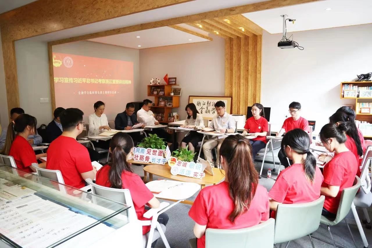 随后,学会临时团支部开展了“学习习近平总书记考察浙江重要讲话精神”主题团日活动, 临时团支部书记周逸凡领学,与会同学结合自身实际,围绕“一个村”“一座城”“一个馆”“一座园”分享感悟。来自义乌的王竟逸同学说“作为义乌的一份子,我在大学不断提升自我,希望未来反哺我热爱的义乌。”来自温岭的许瑾说“温岭人民也是凭借着持之以恒的努力与坚韧,创造出了一条崭新的发展道路。我也会继续发扬祖辈、父辈的艰苦创业精神。”学会副会长郭宇芯谈到将“枫桥经验”的智慧运用到学会日常管理运行中,自己也收获颇丰。副会长张芮晗结合自己观看亚运会开幕式的体验,谈到老员工要树立文化自信,学会分析、辨别外来文化。会员管理部的王申毅说“作为一名金融专业的青年员工,希望能够运用所学金融知识助力现代化浙江建设。”
