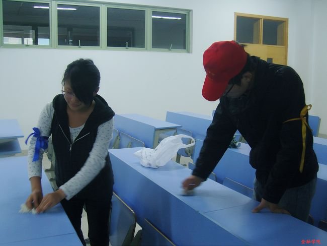 本次活动的地点是ABCD四幢教学楼,由于一些同学在课桌上信笔涂鸦,或者有些考试座位号未擦去,部分课桌狼狈不堪。由此现象入手,志愿者们佩戴不同颜色的丝带,头戴志愿者帽,用毛巾和清洁粉对这些课桌进行了仔细的清洗。在清除这些不文明痕迹的同时,志愿者们也希望用实际行动倡导同学们爱护课桌,为大家提供一个更好的学习环境。