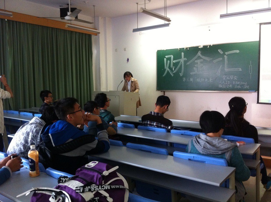 讲座开始后,首先由12级的陈莉莉同学给在场的同学们讲解股票交易的基本知识。她从股票的定义、交易情况和基本术语入手,清晰而富有条理地介绍了股票知识的系统性框架。之前对股票交易知识知之甚少的同学在她的讲解下对股票有了初步的认识,纷纷表示受益匪浅。