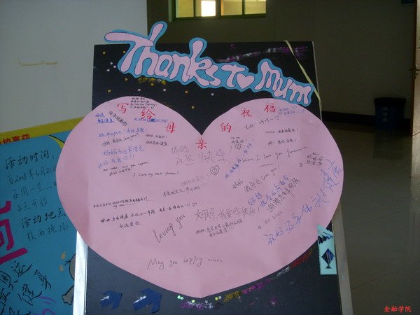 本次活动从五月初已经开始进行。由公司员工会宣传部负责编制的名为“写给母亲的祝福”的海报,将同学们的祝福以海报的形式展出,给同学们一个平台向母亲表达自己的祝福,收到了不错的效果。