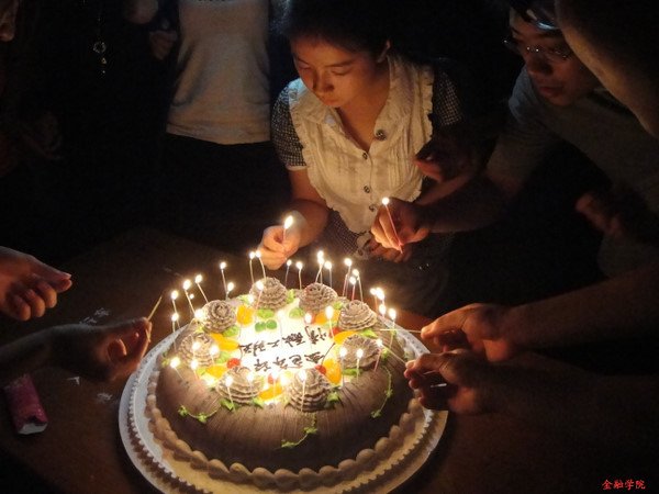 班会还在表演之间还穿插了丰富多彩的游戏,使同学们在轻松的氛围中,不但展示了个人的才艺,而且培养了集体合作的精神。游戏和表演之后,一个写着班会主题的蛋糕被摆在了会场中间,全体同学依次在蛋糕上插上了小蜡烛,顿时蛋糕上便呈现出一圈橙色的光晕,此时全体同学不约而同地手拉手围成了里外两圈,唱起了生日歌,那发自内心的旋律如同一根无形的线,把所有金融二班的成员联系在一起,庆祝班级的一岁生日。