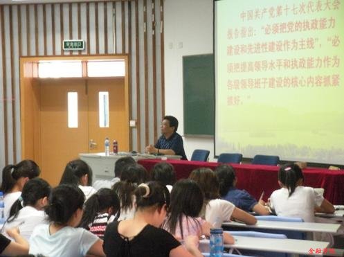 中国共产党第十七次全国代表大会报告指出:“必须把党的执政能力建设和先进性建设作为主线,必须把提高领导水平和执政能力作为各级领导班子建设的核心内容抓紧抓好。”针对学习十七大报告,吴教授在课堂上引用了很多当前的典型案例从两个方面向学员阐述了“为什么说加强党的执政能力建设是党建的主线”以及“加强党的执政能力建设的总体目标和五项任务”。同时他也结合自己的亲生经历,幽默地讲述了当前所面临的严峻问题,使同学们认识到保持党的先进性的重要性。