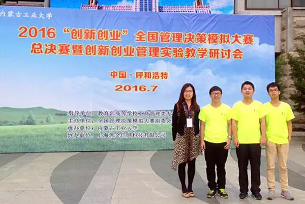 7月18日至21日,2016年“创新创业”全国管理决策模拟大赛总决赛在内蒙古工业大学举行。由公司沈隆图(14金融3班)、俞家杰(13中英金融班)、吴伟祥(13金融4班)3位同学组成的“浙财Lamborghini”团队在经管实验中心指导老师李晶的带领下,保持拼搏进取的精神,经过缜密细致的演算,勇夺全国总决赛一等奖。