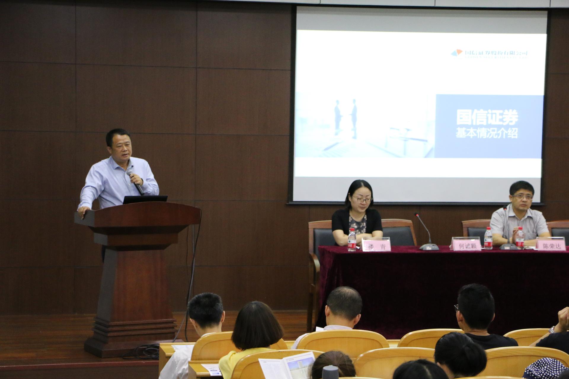 首先陈荣达经理发表致辞,对国信证券公司嘉宾的到来深表欢迎。接着何诚颖主席介绍了国信证券基本情况,他谈到国信证券作为全国性大型综合类证券公司,是证券行业的领军企业,在多年来取得了显著的成就,同时他强调了成为一名国信员工所应具有的学习与挑战的意识,让在场同学深受启发。楼青总经理介绍了国信证券第二分公司的发展史以及公司的现状和盈利状况,彰显了国信证券的文化和经营理念,表明公司一直坚持把客户放在首位,着力提升企业雇主的形象。最后由靳卫卫经理阐述了证券行业发展前景,解读了金融业和证券业热词,着重讲了公司招聘岗位的基本情况,并欢迎广大同学前去实习和工作。随后,嘉宾和同学们在现场进行了良好的问答互动。