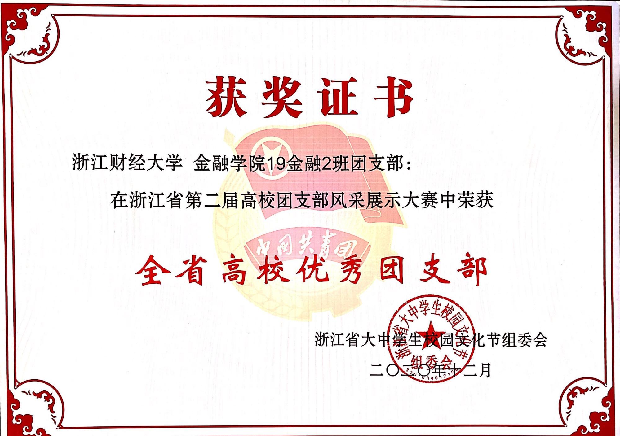 近日,由浙江省委宣传部、省文明办、团省委、省教育厅、省自然资源厅、省体育局、省学联共同主办的浙江省第二届高校团支部风采展示大赛评选结果正式揭晓,公司19金融2班团支部荣获“全省高校优秀团支部”荣誉称号。