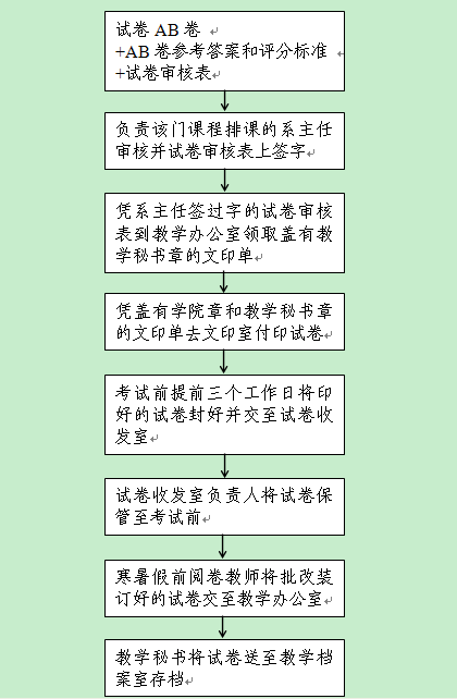 根据公司《迎接教育部本科教学工作审核评估动员大会》的会议精神,经云顶7610线路检测教学委员会讨论决定从2016 – 2017学年第一学期起依照试卷管理流程对试卷的审核、付印、保管、装订、存档等工作进行管理,具体流程如下: