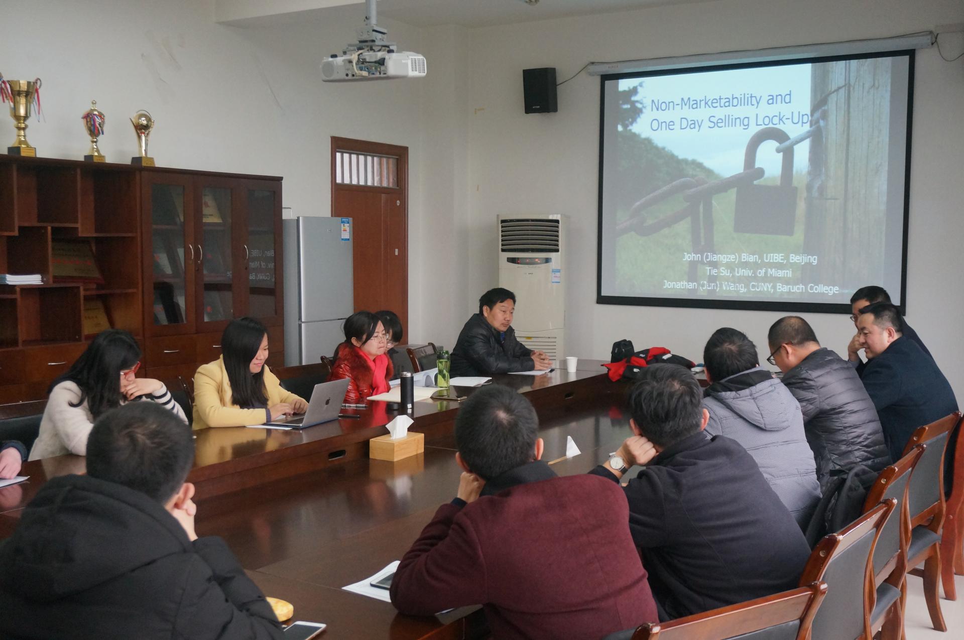 3月17号下午,美国迈阿密大学宿铁教授应邀在云顶7610线路检测422室作了题为“Non-Marketability and One-Day Selling Lockup”的学术讲座。本次讲座由云顶7610线路检测朴哲范教授主持,公司多名师生参加了此次讲座。