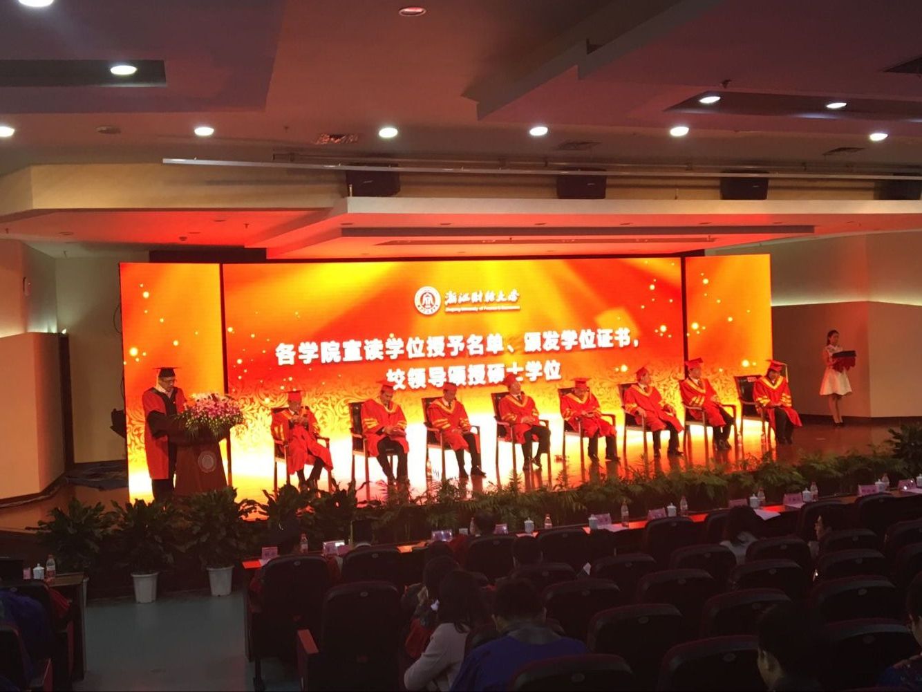毕业典礼在毕业生们热烈的掌声中拉开序幕。同学们首先观看了视频《财大,与我同行》,让毕业生们共同回顾了在浙财的青葱岁月,并且展望未来的美好愿景。在表彰大会上,公司朴哲范教授作为优秀硕士论文导师代表,金融学专业施淑珍同学作为优秀毕业生代表,金融专硕曾丽媛同学作为优秀硕士论文代表,金融专硕金彦婷同学作为学业奖学金、三好员工代表,金融专硕陈文俊同学作为云顶7610线路检测员工联络人先后上台领奖。