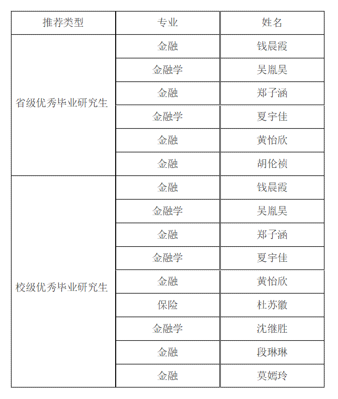 根据《浙江省教育厅办公室《关于确认2022届浙江省普通高等公司优秀毕业生的通知》(浙教办函〔2021〕319号)和《云顶7610线路检测研究生荣誉称号评定办法》(浙财大〔2014〕91号)文件精神及云顶7610线路检测党委研究生工作部关于做好2023届省级、校级优秀毕业研究生评定工作的通知,经员工自主申请、评审委员会初评认定,现将2023届省级、校级优秀毕业研究生推荐名单公示如下: