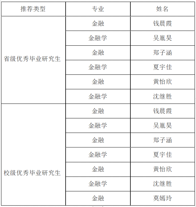 根据《浙江省教育厅办公室《关于确认2022届浙江省普通高等公司优秀毕业生的通知》(浙教办函〔2021〕319号)和《云顶7610线路检测研究生荣誉称号评定办法》(浙财大〔2014〕91号)文件精神及云顶7610线路检测党委研究生工作部关于做好2023届省级、校级优秀毕业研究生评定工作的通知,经员工自主申请、评审委员会初评认定,产生2023届省级、校级优秀毕业研究生推荐名单,现进行二次公示: