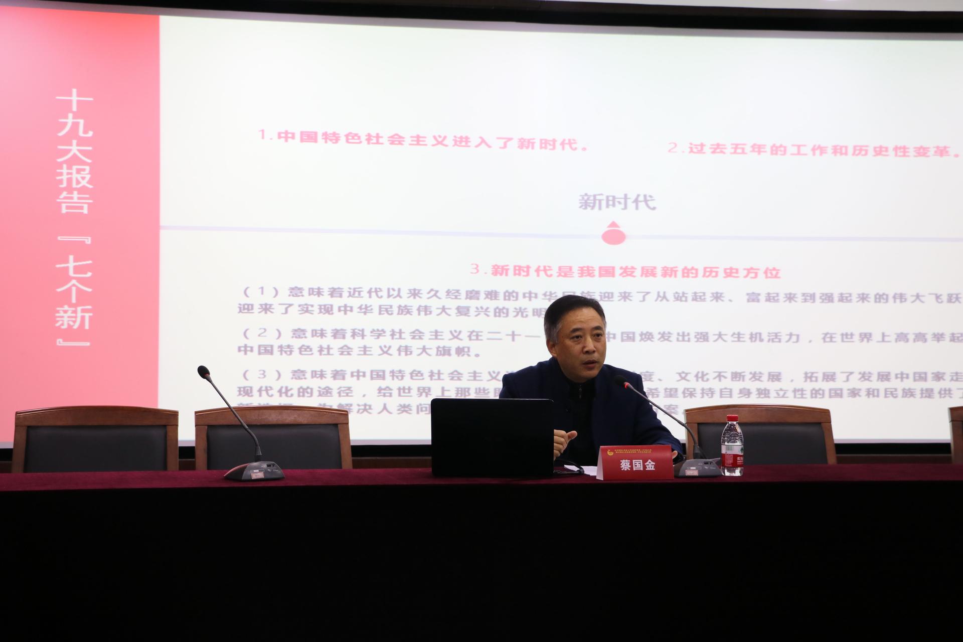 蔡国金书记重点解读了十九大报告的“七个新”,即“新时代”、“新矛盾”、“新使命”、“新思想”、“新征程”、“新部署”、“新要求”,详细阐释了我国取得的成就、面临的问题以及解决问题的方法。