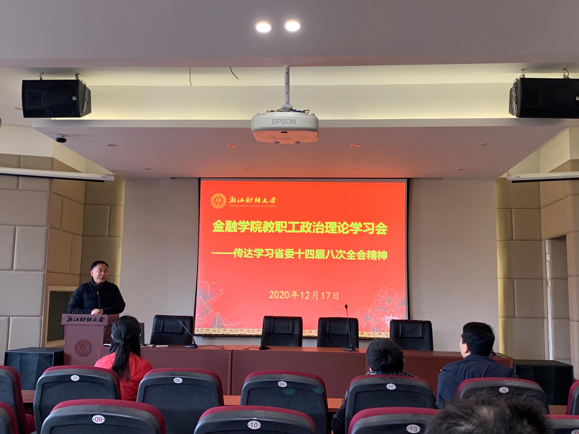 会上,蔡国金指出省委十四届八次全会是贯彻落实中央十九届五中全会精神所召开的一次极其重要的会议,对浙江省的建设发展具有里程碑意义。他指出学习贯彻省委十四届八次全会精神是当前一段时间各级党组织的重要政治任务,我们全院师生要紧扣“忠实践行‘八八战略’、奋力打造‘重要窗口’”的主题主线,坚决把思想和行动统一到中央和省委的部署要求上来。他强调要在公司的实际工作中加强学习精神,坚持明确“一条主线”,深刻领会全会核心要义,并做到三个结合:一是将学习与人才培养相结合,引导员工正确了解浙江建设发展大局;二是将学习与科学研究相结合,发挥我们的学科优势,贡献浙财金融力量;三是将学习与管理服务相结合,切实增强“窗口”意识,全面争先创优,为公司学术建设发展做出应有贡献。