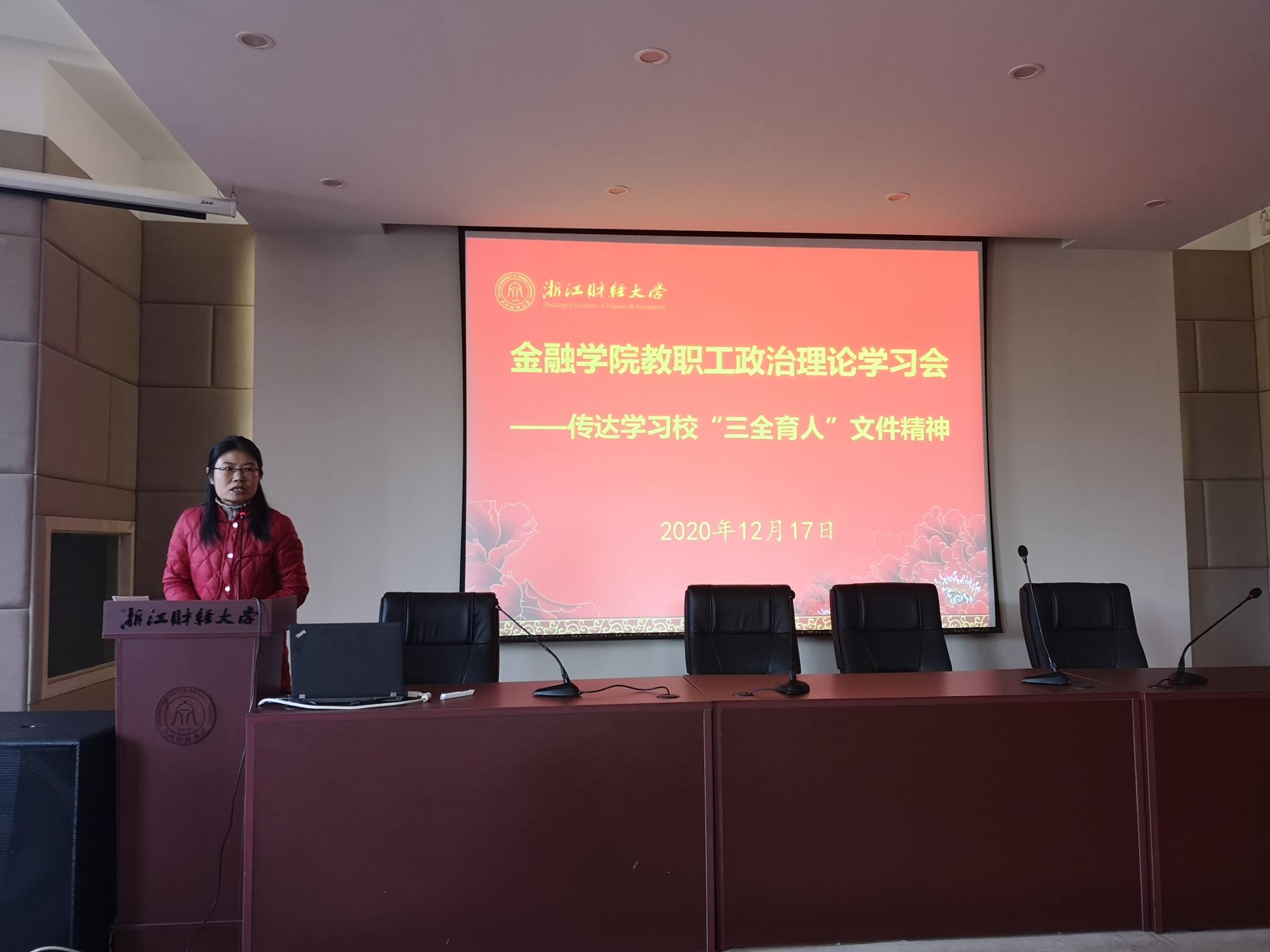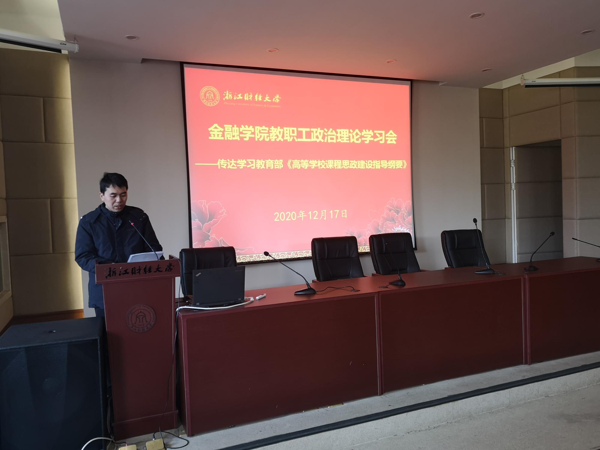 傅俊辉传达了教育部《高等公司课程思政建设指导纲要》的重要精神和内容,对纲要出台的背景和重要意义、全面推进高校课程思政建设的工作目标、工作思路、构建课程思政内容体系、教学体系、抓好课堂教学建设、提高教师课程思政建设意识和能力、推进课程思政建设工作落实等方面进行了深入解读。他指出,要科学设计课程思政教学体系、立足金融学科的专业特点推进课程思政建设、推动课程思政全程融入课堂教学建设、着力提升专业教师的课程思政建设能力、完善课程思政建设评价激励机制,将思政教育融入专业建设和课堂教学全过程。