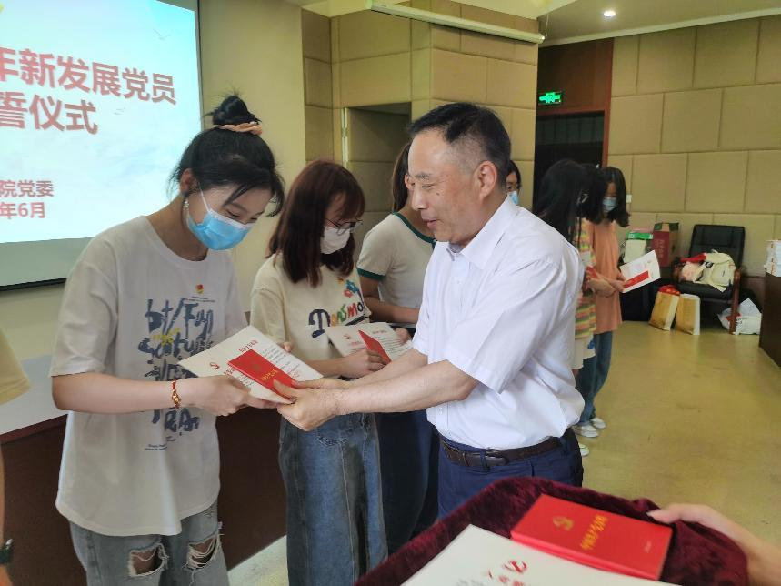 全体党员面向党旗,在蔡国金书记的带领下庄严宣誓,铿锵的誓言表达了自己对党和国家的热爱,并甘愿为共产主义事业奉献终身。随后,蔡国金书记给每一位新发展党员赠送了政治生日贺卡和《中国共产党章程》。