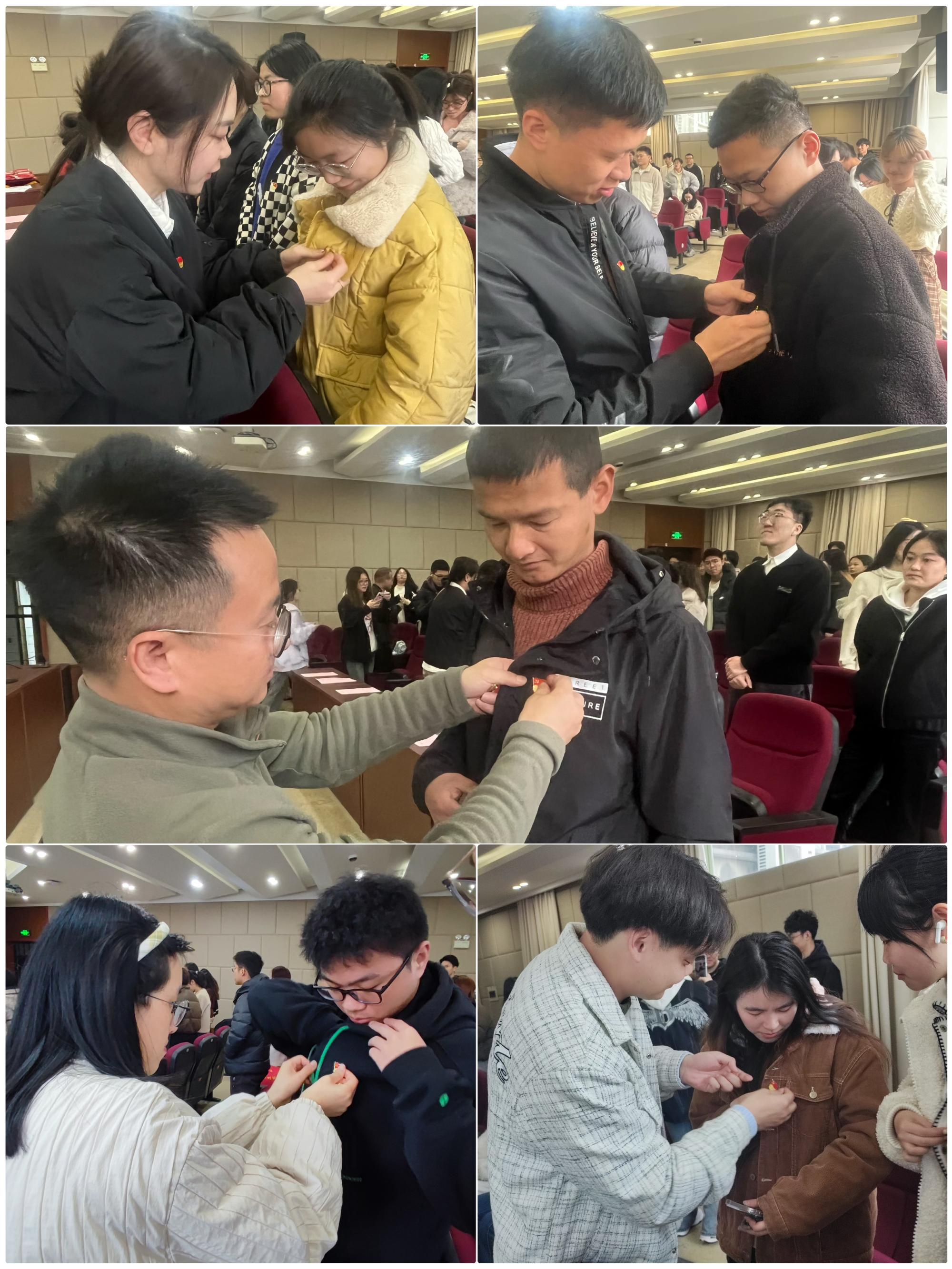 与会老党员为全体新发展党员佩戴了党徽,激励新党员时刻牢记党员身份,以更严格的要求审视自己,用奋斗书写青年党员的责任担当。