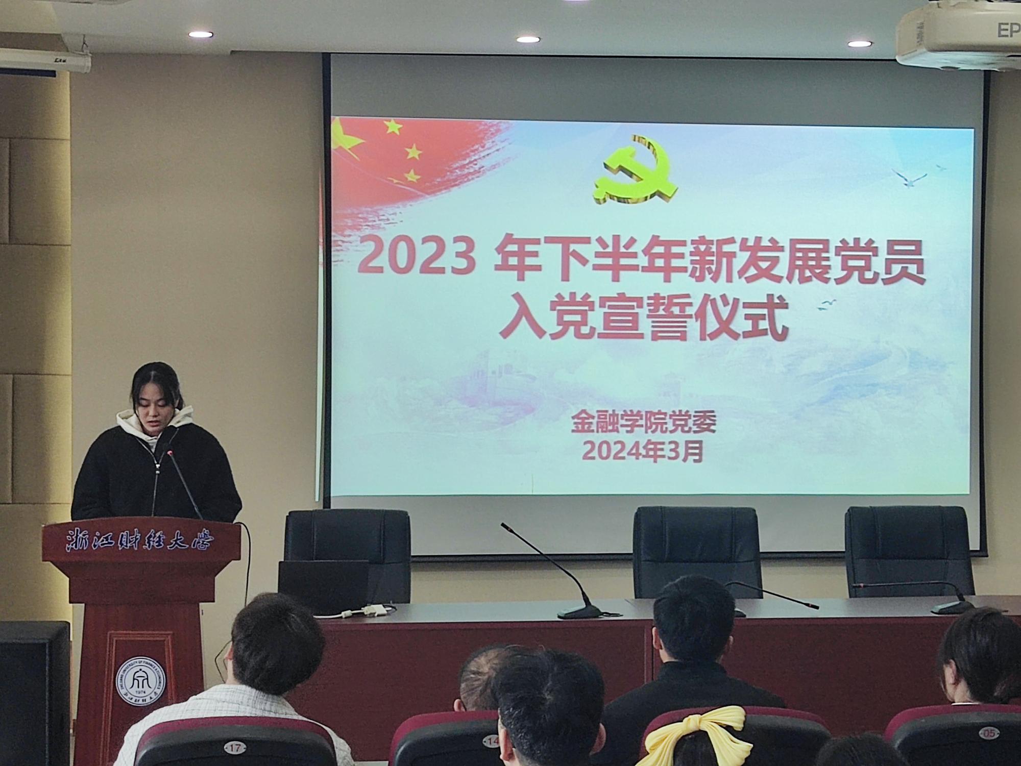 新党员代表叶雨欣同学进行了发言,向党组织承诺将把入党誓词“终生铭记,身体力行”,坚持不断提升自己的思想政治修养;本着全心全意为人民服务的根本宗旨,不断提高自己为人民、为同学服务的本领和能力;保持努力的学习态度,用实际行动争做一名合格的共产党员。