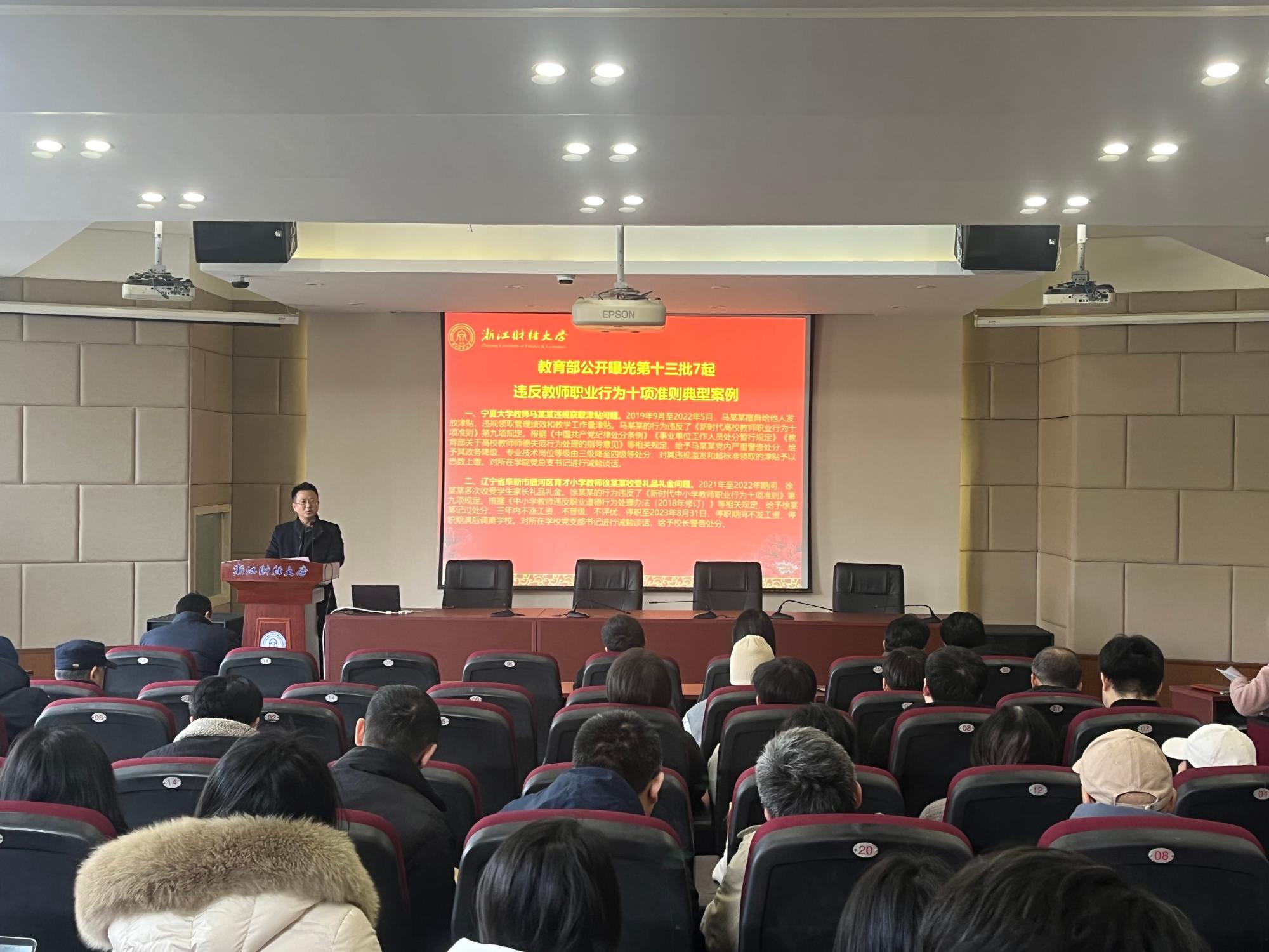 会上,黄文礼传达了《云顶7610线路检测师德失范案例通报与警示教育工作规程》文件要求,通报了《教育部公开曝光第十三批违反教师职业行为十项准则典型案例》,进一步带领全体教师学习《新时代高校教师职业行为十项准则》文件精神,警示老师们要以案为鉴、以案促改,严守师德底线,绝不触碰“红线”。