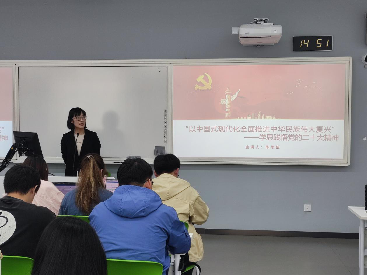 陈思佳围绕《以中国式现代化全面推进中华民族伟大复兴——学习党的二十大精神》的主题,向同学们介绍了中国过去五年取得的16个方面的成就,包含了最具标志性意义的6个方面,以及中国发生的3件大事。告诉我们要把学习贯彻二十大精神与公司全面推进特色鲜明的一流财经大学结合起来,为此,我们必须坚持和加强党的全面领导,坚持中国特色社会主义道路,坚持以人民为中心的发展思想,坚持深化改革开放,坚持发扬斗争精神。