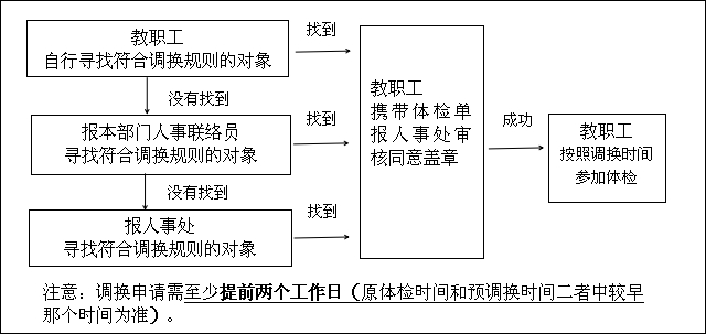 由于医院体检中心每天接待能力有限,为保证服务质量,请各位教职工务必按照医院排定的日期进行体检(体检日期在个人体检单左上方)。如遇特殊情况,确需调换体检时间的,请尽量按照如下规则调换: