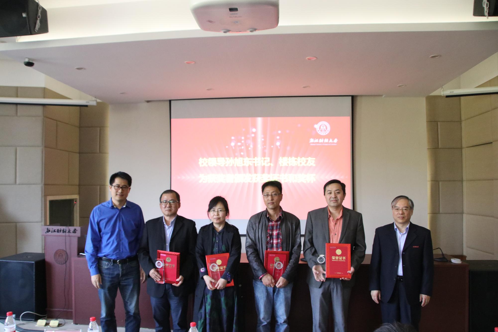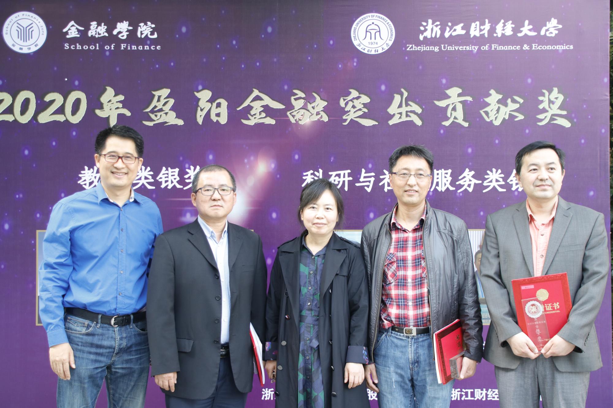 经评审,朴哲范老师、阎晓春老师分别获得2020年盈阳金融突出贡献奖教学类银奖;钟立新老师、耿中元老师分别获得科研与社会服务类银奖。孙旭东书记、楼栋员工为获奖老师颁发了获奖证书及奖杯。